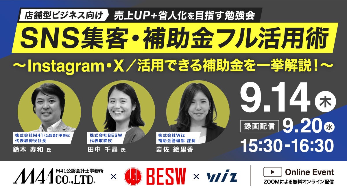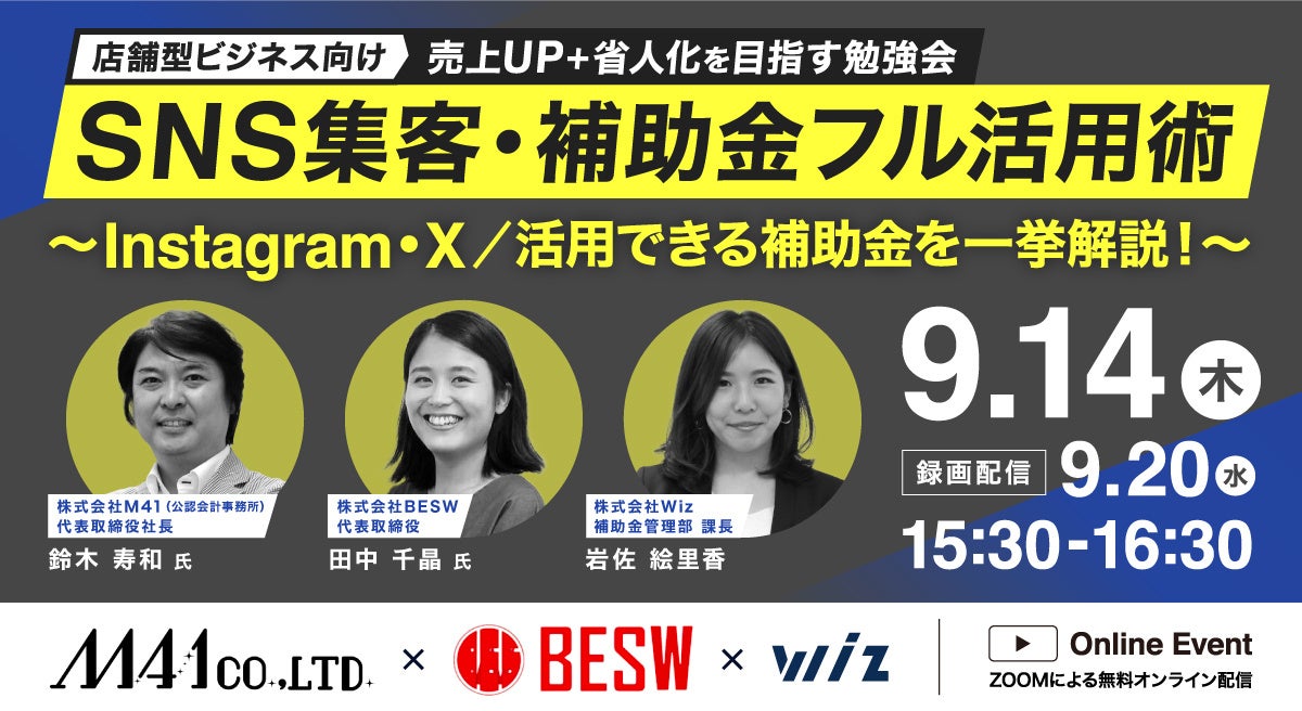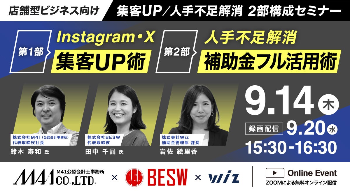 【9/14(木) 店舗型ビジネス向け:2部構成セミナー】Instagram・X集客UP術/人手不足解消に活用できる補助金を一挙解説!