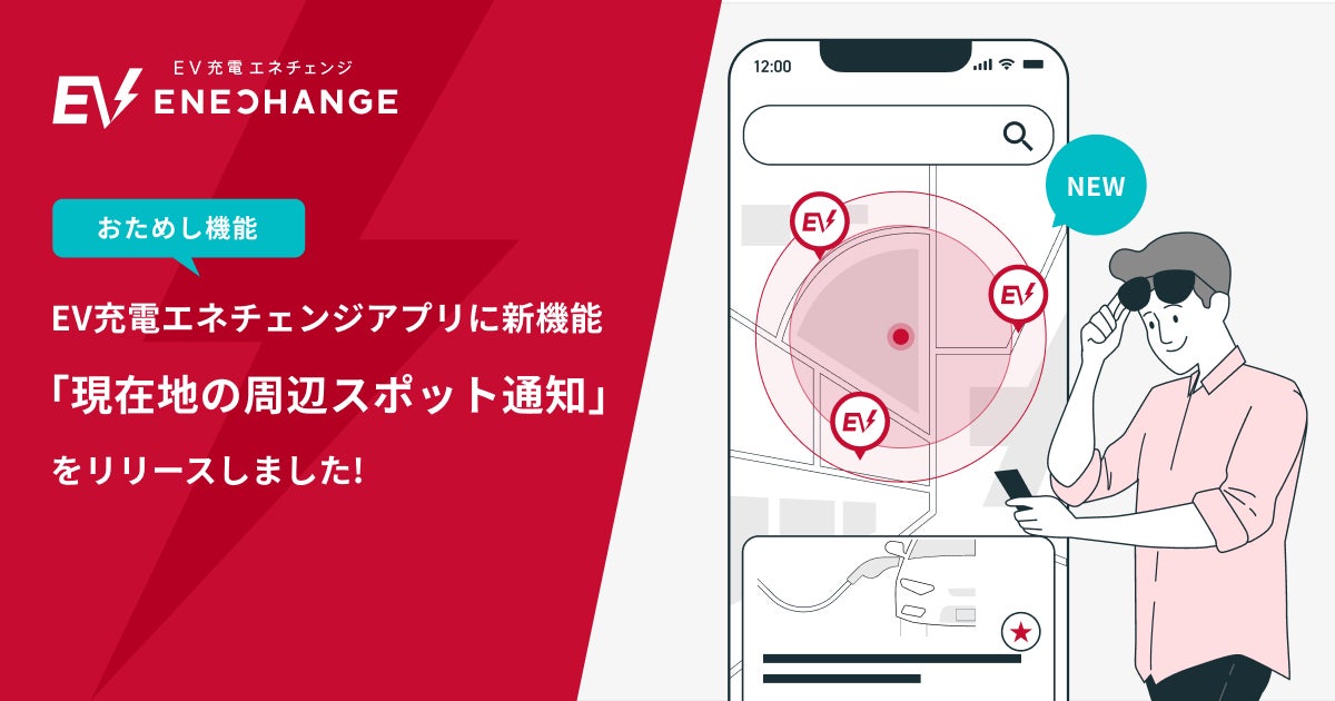ENECHANGE(エネチェンジ)株式会社(本社:東京都中央区、代表取締役CEO:丸岡智也、以下「エネチェンジ」)は、EV充電エネチェンジアプリの新機能として「現在地の周辺スポット通知(おためし機能)」をリリースしました。本機能は、EV充電エネチェンジアプリの利用者の位置情報をもとに、近くのEV充電エネチェンジの充電スポットを通知するものです。トライアル機能のため、皆さまからのフィードバックを反映し、さらなる改善を進めてまいります。
