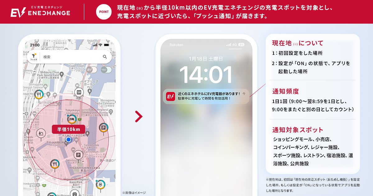 現在地(※)から半径10km以内のEV充電エネチェンジのスポットを対象とし、充電スポットに近づいたら(目安としてスポットの半径300m以内に入ると)プッシュ通知が届きます。