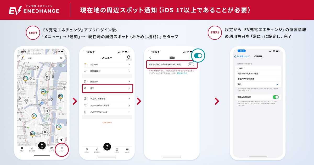 「EV充電エネチェンジ」のアプリログイン後、「メニュー」→「通知」→「現在地の周辺スポット(お試し機能)」をタップします。スマートフォンの「設定」から、「EV充電エネチェンジ」の位置情報の利用許可を「常に」にすると、設定は完了です。