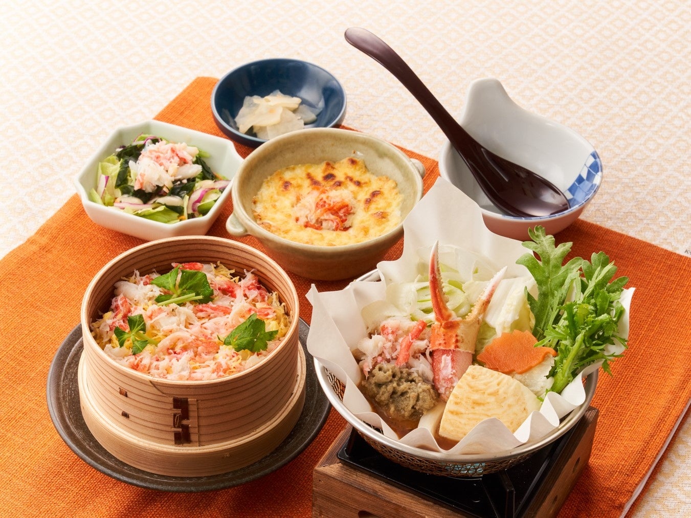 卓上で煮込む小鍋・焼き立てのグラタン・蒸したてのせいろ御飯のあつあつ3品に、本ずわい蟹のサラダもついた“蟹の旨味”を存分に楽しめるご褒美御膳です。