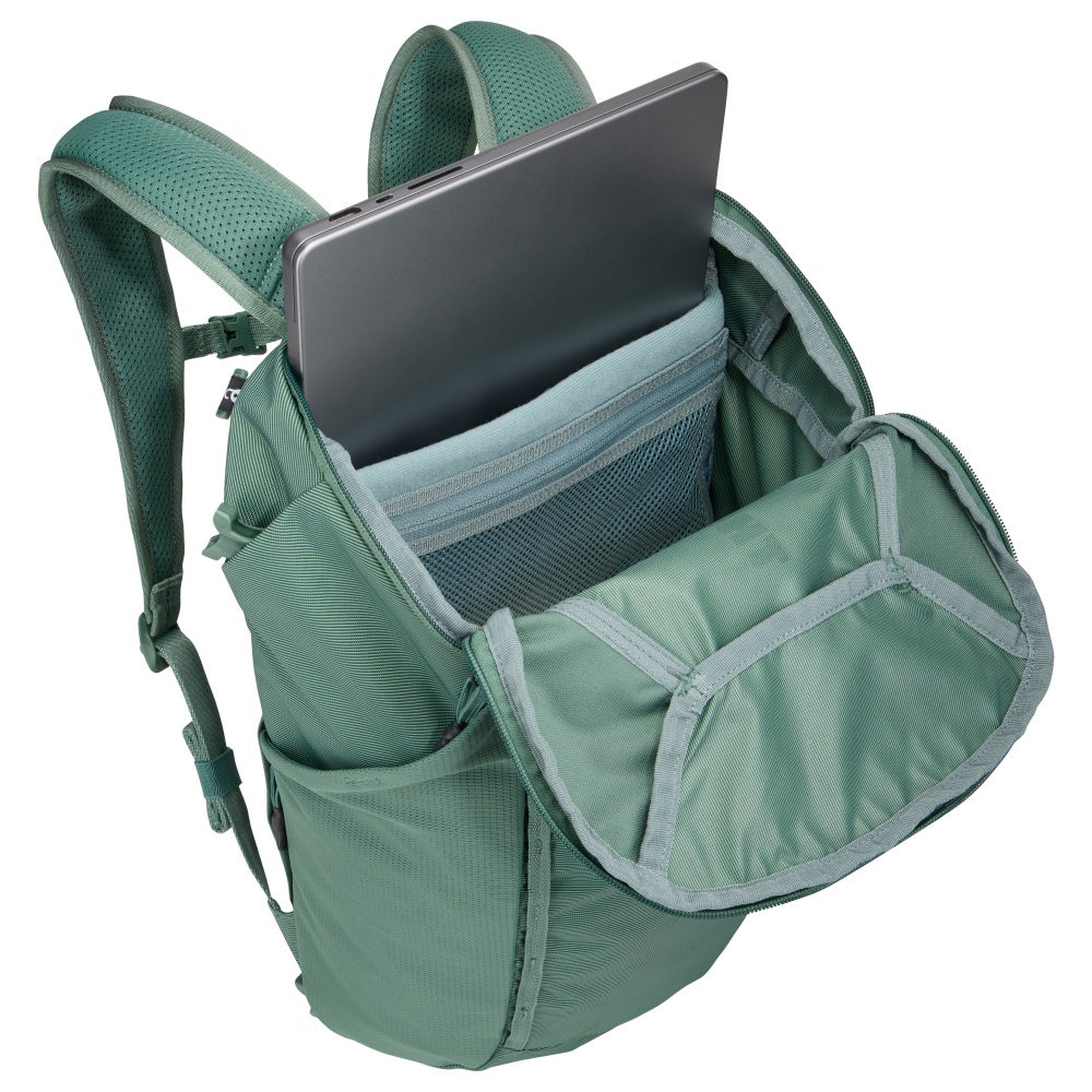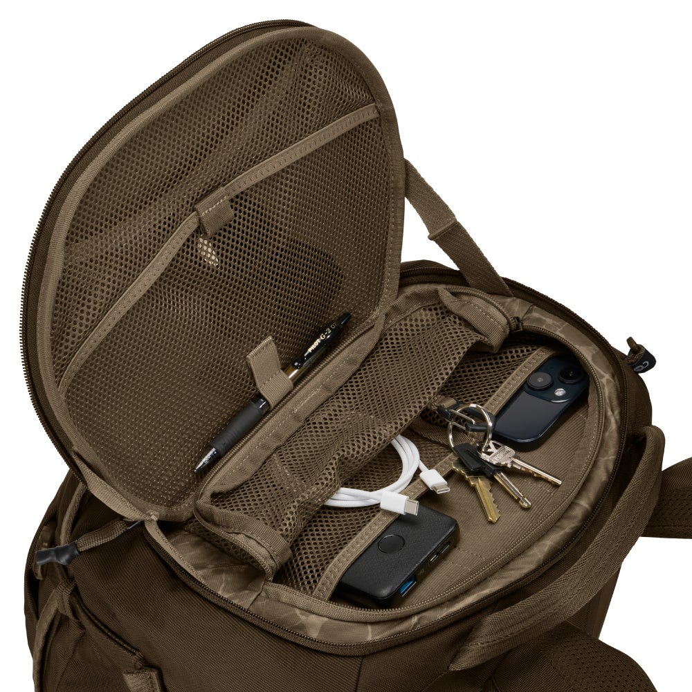 メッシュ仕切りが付いたTHULEのアイコニックな大型SafeZoneポケットは、セミハード成形となっておりガジェットやサングラスを保護収納します。旅行中も大切なPCを保護する厚手パッド入りPCポケットも装備。メッシュポケットやジップ式サイドポケットで旅道具の整理ができます。メイン荷室開口部は大きく開くため、パッキングがスーツケースのように容易です。一日分の荷物量に最適な20Lサブバッグは、PCポケットやメッシュポケット、2つのサイドポケット、隠しポケットを装備。