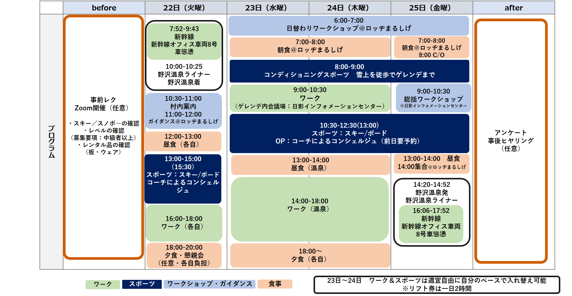 ・内 容:パーソナルトレーナーによるウィンタースポーツレッスンを体験し、スポーツとワークを交互に行うことで脳が活性化され、ワークエンゲージメントの向上やウェルビーイングを体感していただいます。