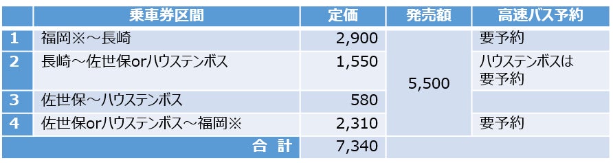この乗車券は、福岡市内(博多・天神・福岡空港)と、西九州新幹線開業で活気あふれる「長崎市中心部エリア」、ハンバーガーやレモンステーキといったグルメや九十九島の美しい景観が人気の「佐世保エリア」、それに九州随一のテーマパーク「ハウステンボス」との間の高速バスや路線バス乗車券をセットにし、通常価格の約25%割引となる5,500円で販売する大変便利でお得なものです。