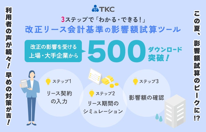 中堅・大企業向けに固定資産管理システムなどを提供する株式会社TKC(本社:栃木県宇都宮市/代表取締役社長:飯塚真規)は、本年1月に提供を開始した「新リース会計基準の影響額試算ツール」のダウンロード数が500件を突破したことを受け、当ツールを利用された企業にその効果などをヒアリングいたしました。