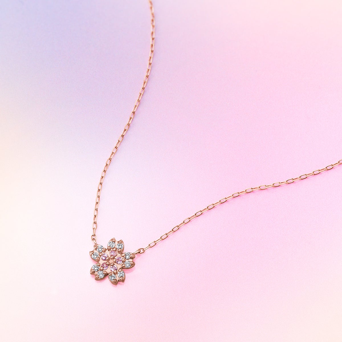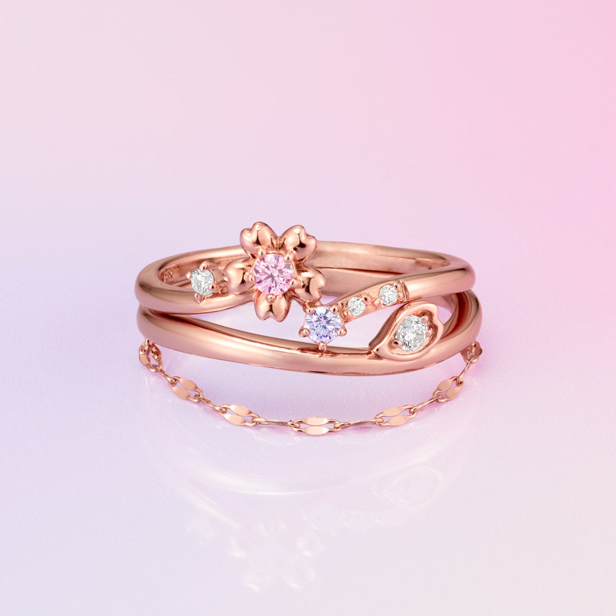 そよ風に舞う桜の花びらを描いた軽やかさが魅力のシリーズ。ふたつのモチーフが出会うような2wayネックレス、小ぶりながらも立体感があり、横顔を美しく引き立てるピアス、流れるラインが優しさを描くリングなど、小さな仕草から気品が宿るデザインが揃いました。ブルーやピンクのグラデーションストーンが、咲きはじめた桜のように、そっと彩りを添えます。