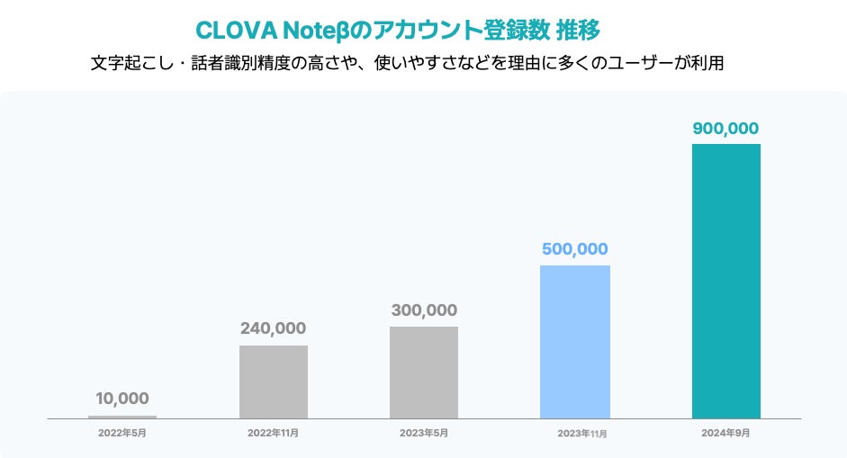 2022年5月より提供してきた、AI技術活用により音声を文字に変換し記録を管理するサービス「CLOVA Note β」はアカウント登録者数が90万人(2024年8月時点)を突破いたしました。