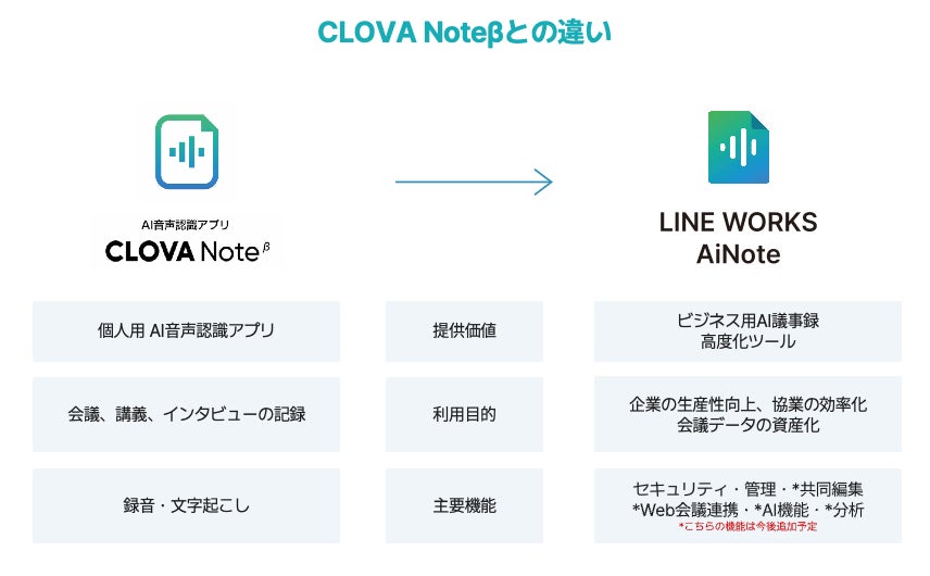 従来の「CLOVA Noteβ」は、録音・文字起こしを中心としたシンプルな機能でしたが、「LINE WORKS AiNote」では、法人企業でも安心して便利にご利用いただけるように、セキュリティや管理機能を強化いたします。そして生産性の向上、協業の効率化、会議データの資産化などを支援するツールへと進化していきます。