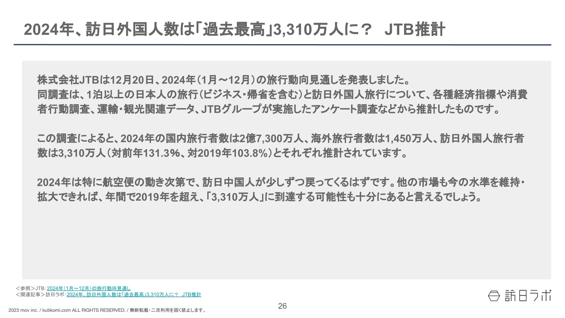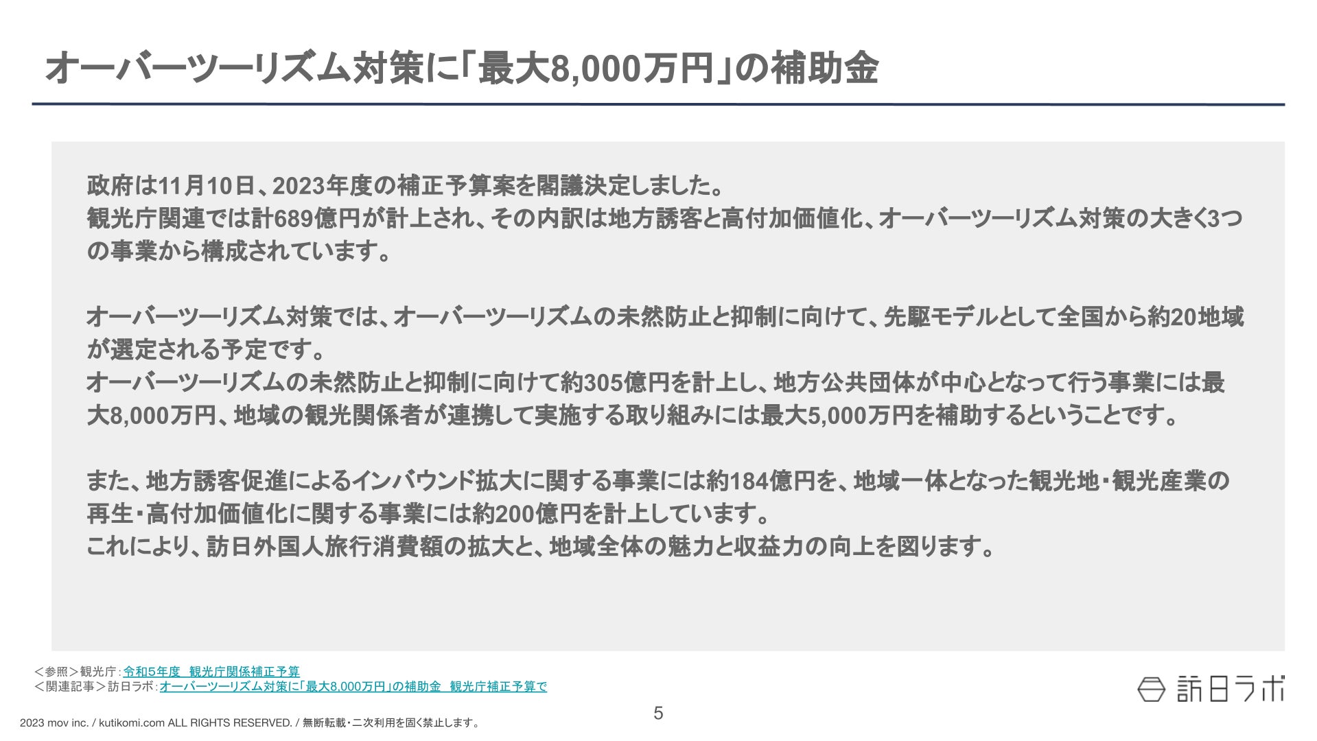国内最大級のインバウンド総合メディア「訪日ラボ」を運営する株式会社mov(代表取締役:渡邊 誠、本社:東京都渋谷区、以下mov)は、「インバウンドに関連する政府&自治体などの取り組み」「インバウンド関連データ」を始め、インバウンド対策に役立つニュースをまとめた「インバウンド動向まとめ【2023年11月〜12月版】」を公開しました。
