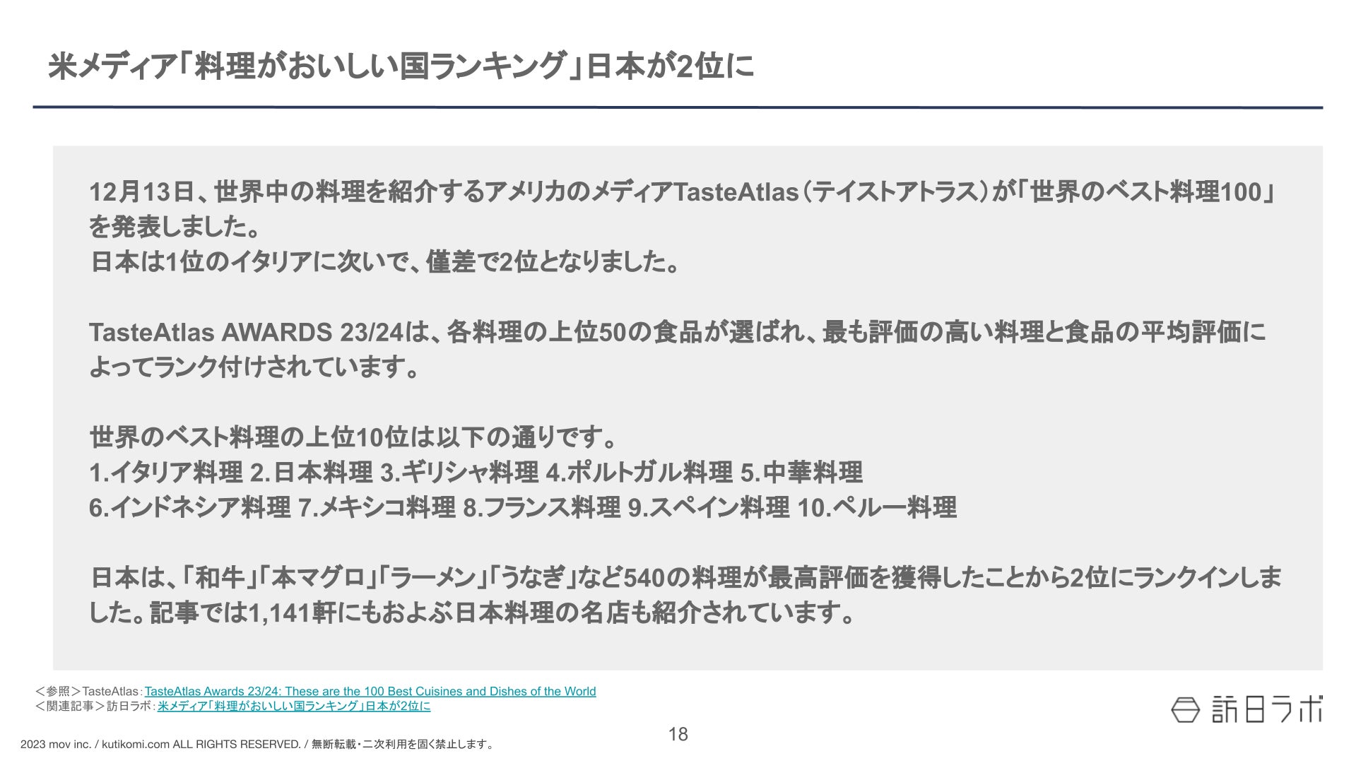 2024年の訪日外国人数は「過去最高」JTB予測 / 「料理がおいしい国ランキング」日本が2位に ほか