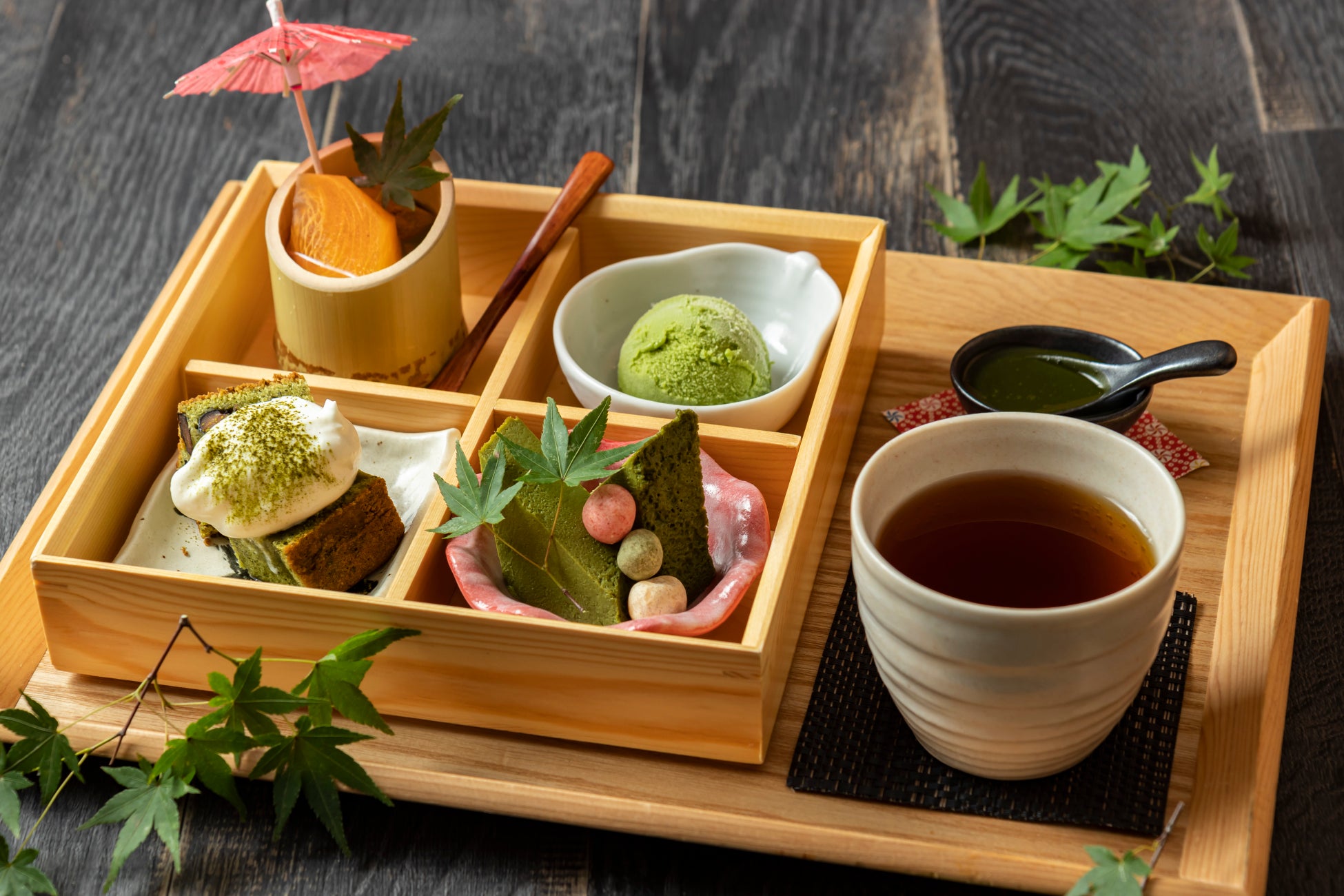 お客様自身が茶筅で抹茶をたてる体験ができ、ミニたいやきやみたらし団子、ほうじ茶ババロアなどの和スイーツとともに楽しめる、京都ならではの文化体験型メニューです。