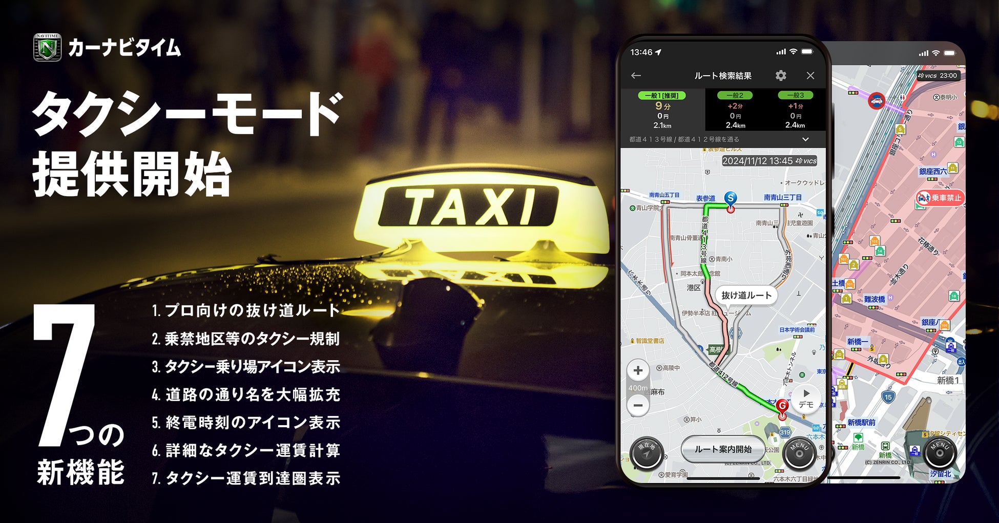 株式会社ナビタイムジャパン(代表取締役社長:大西 啓介、本社:東京都港区)は、2024年11月20日(水)より、カーナビアプリ『カーナビタイム』にて「タクシーモード」を新設し、7つのタクシードライバー向け新機能を提供開始します。