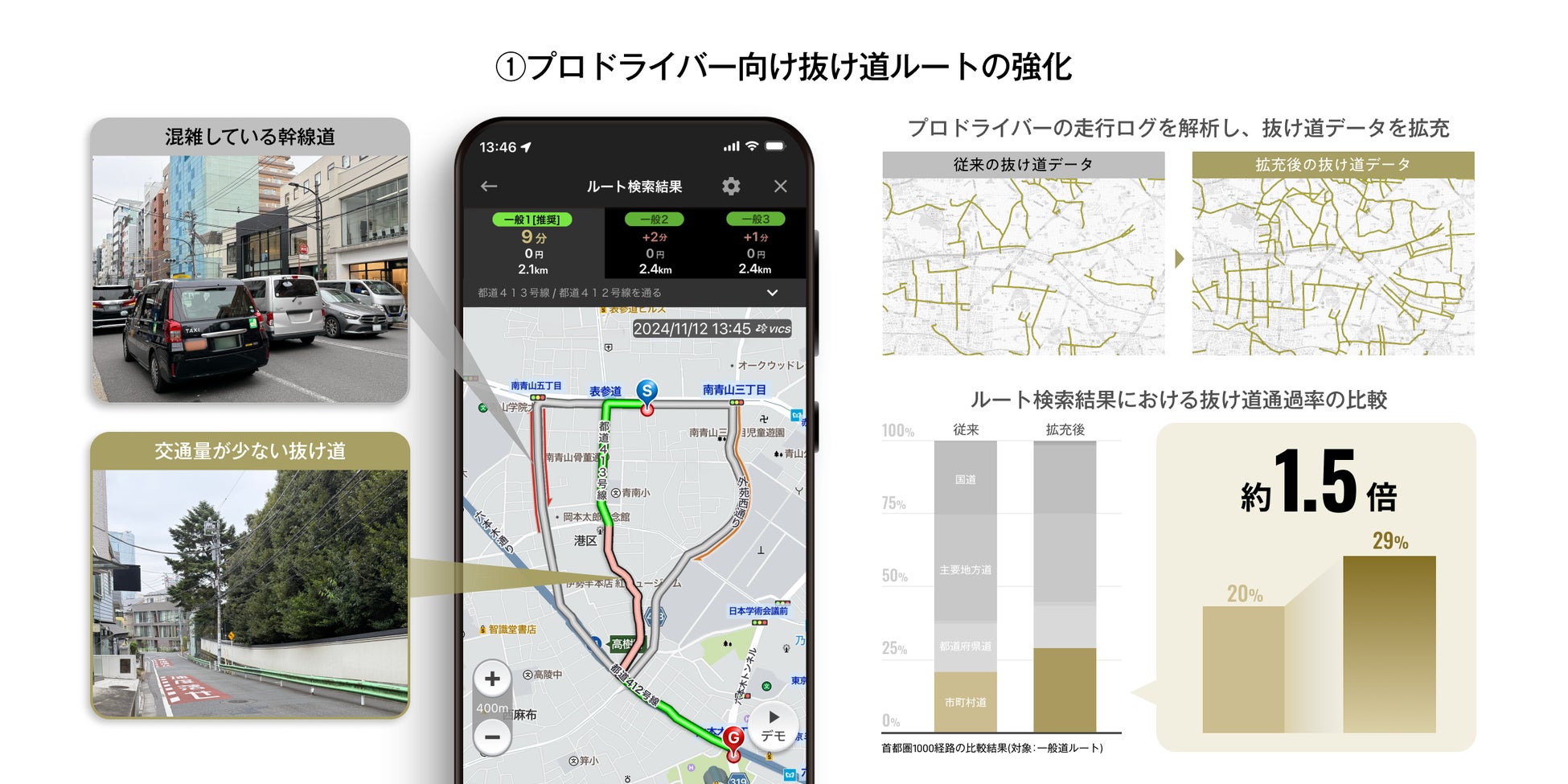~抜け道を含むプロドライバー向けルートの強化や、乗車禁止エリア、駅の終電時間、通り名の地図表示等で業務支援~