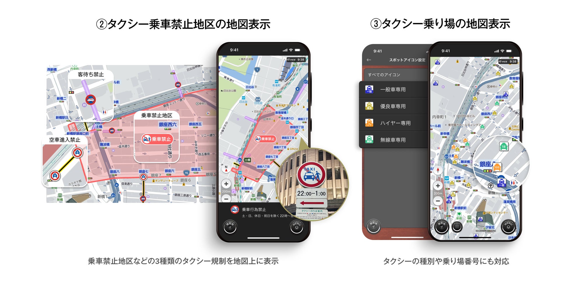 また、「タクシー乗車禁止地区」や駅の終電時刻のような、タクシードライバーならではの必要機能を、視覚的にわかりやすく地図上に表示できるようになります。