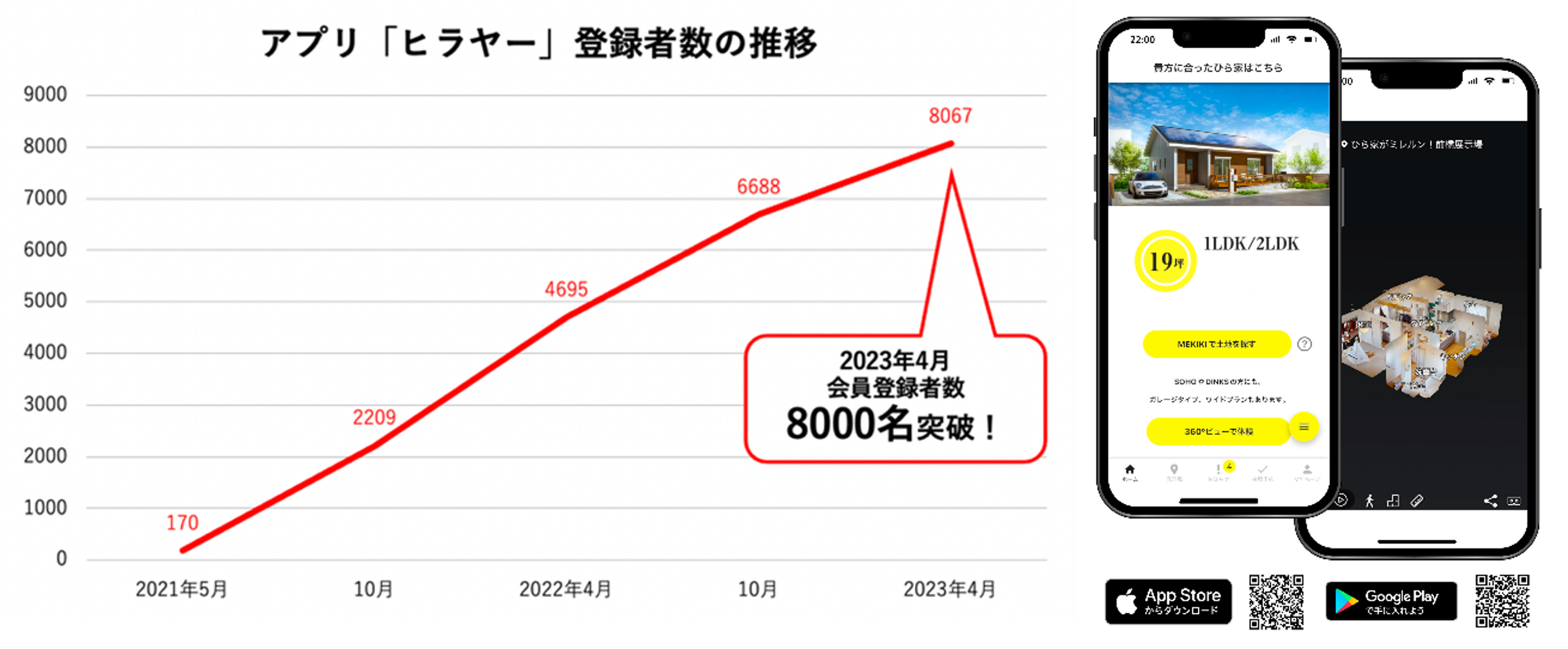 IKIのアプリ「ヒラヤー」は、お客様に合った平屋プランの提案からVRでの内覧、引き渡しまでサポートするアプリです。3Dモデルハウスの360°ビューにより、展示場へ足を運べない場合でも、手軽にIKIを見学できます。さらに屋内を採寸することができるので、家具や家電の収まりを検証できます。また、外観・壁などの色づかいのシミュレーションによりインテリアコーディネートがスムーズにでき、ご契約前に徹底して納得できることから好評を博してきました。これらIKI独自の施策は、住宅購入検討者がIKIに注目する一つの要因となっていると考えられ、その結果「ヒラヤー」は、2021年4月26日のリリース以降、好調にその利用者数を伸ばし続け、2023年4月19日時点でダウンロード数22,000回を突破し、そして同年4月末日には会員登録数が8,000名を超えました。