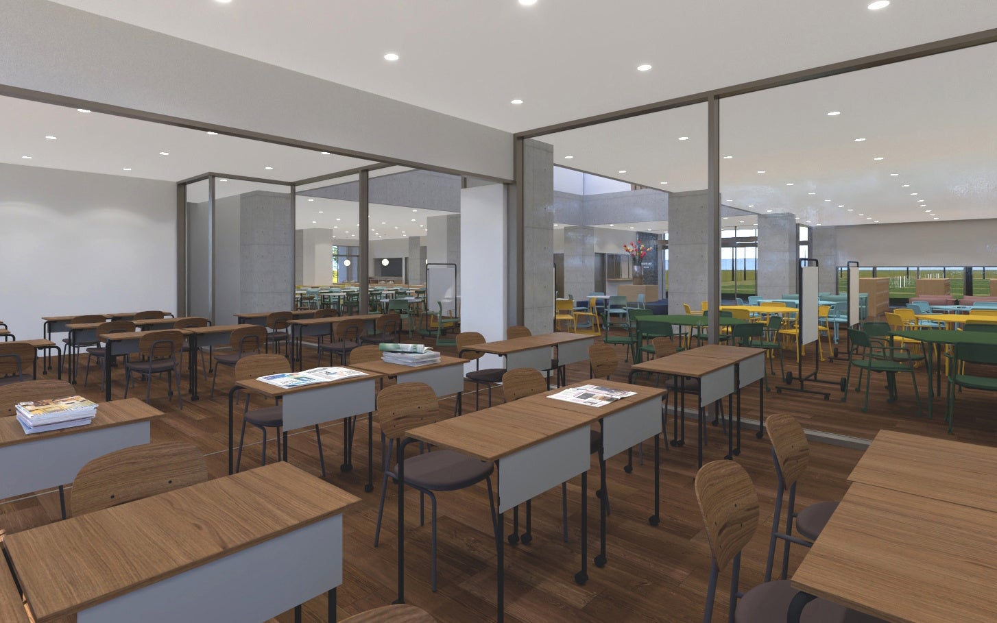 生徒同士の自発的な交流やイベント、グループワークが可能な「ラーニングコモンズ」をはじめ、集中して学習に取り組める「共同学習室」や「スタディルーム」を完備。さらに、大浴場やトレーニングルームも備えており、心身ともにリフレッシュできる環境を整えています。