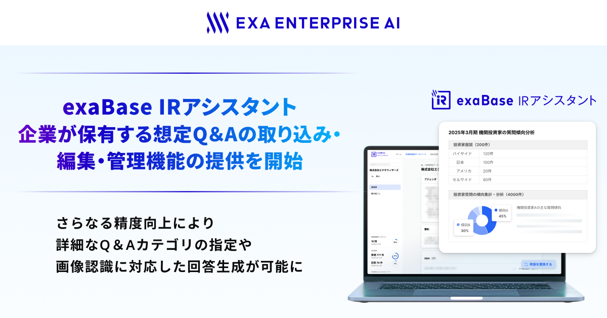 exaBase IRアシスタント、企業が保有する想定Q&Aの取り込み・編集・管理機能の提供を開始