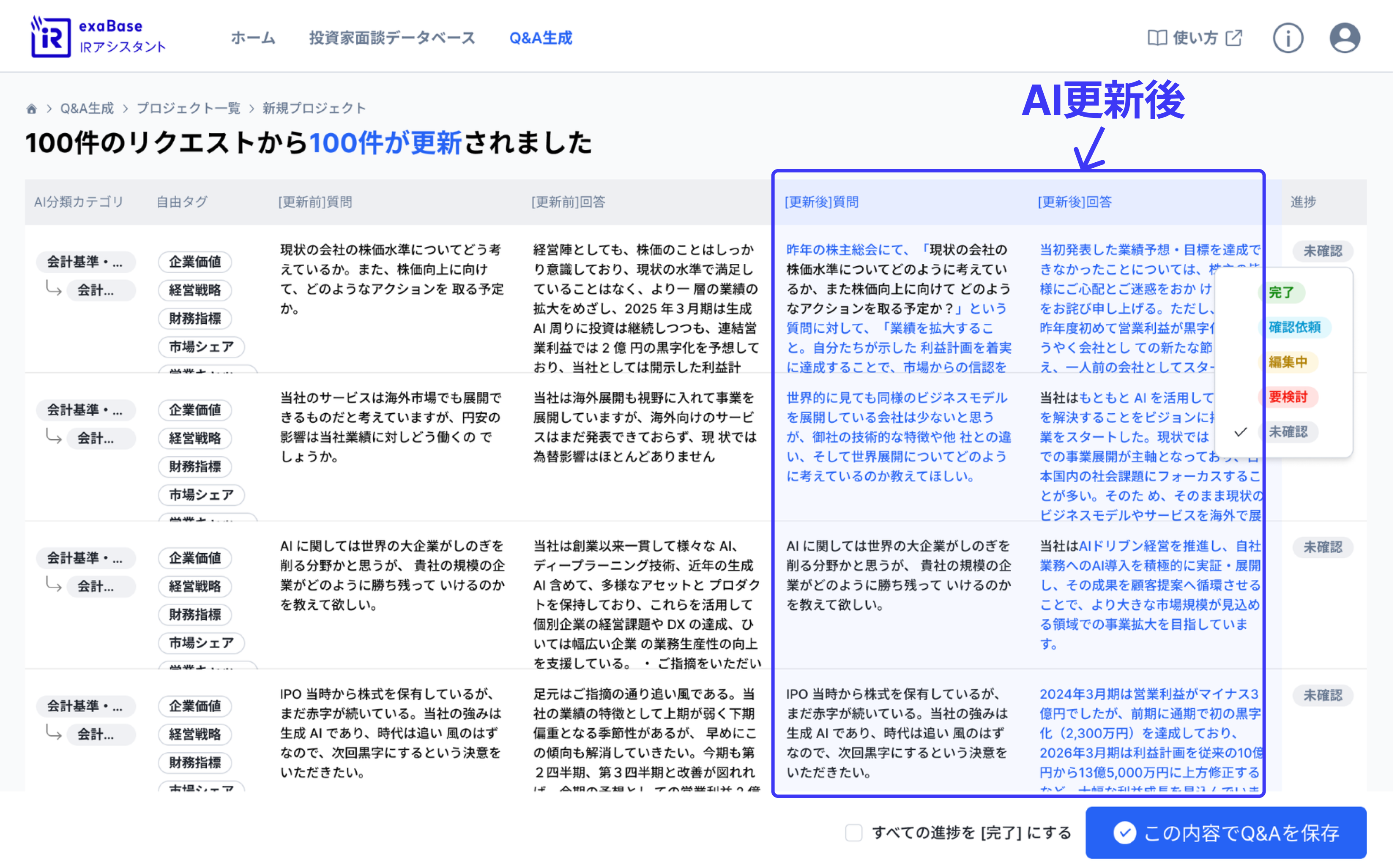 ボタン一つで更新・編集:取り込んだQ&Aは、最新の有価証券報告書や決算説明資料などをもとにした更新機能によって、ボタン一つで更新・編集することが可能です。これにより、過去の資産を活かしつつ、最新の開示情報に基づいたブラッシュアップが効率的に行えます。