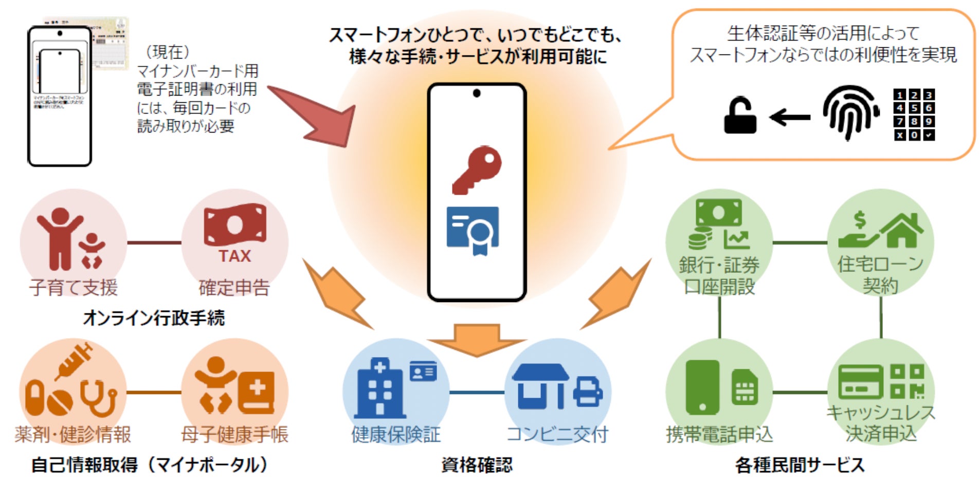 そして本日より、Androidスマートフォン向けの「公的個人認証サービス」(スマホ用電子証明書)が提供開始され、電子証明書をスマートフォンに登録することで各種行政手続き(①子育て支援/確定申告などのオンライン行政手続、②薬剤・健診情報/母子健康手帳などの自己情報取得(マイナポータル)、③健康保険証/コンビニ交付などの資格確認、④銀行・証券口座開設/住宅ローン契約/携帯電話申込/キャッシュレス決済申込などの各種民間サービス)の本人確認を簡単に行うことが可能になりました。