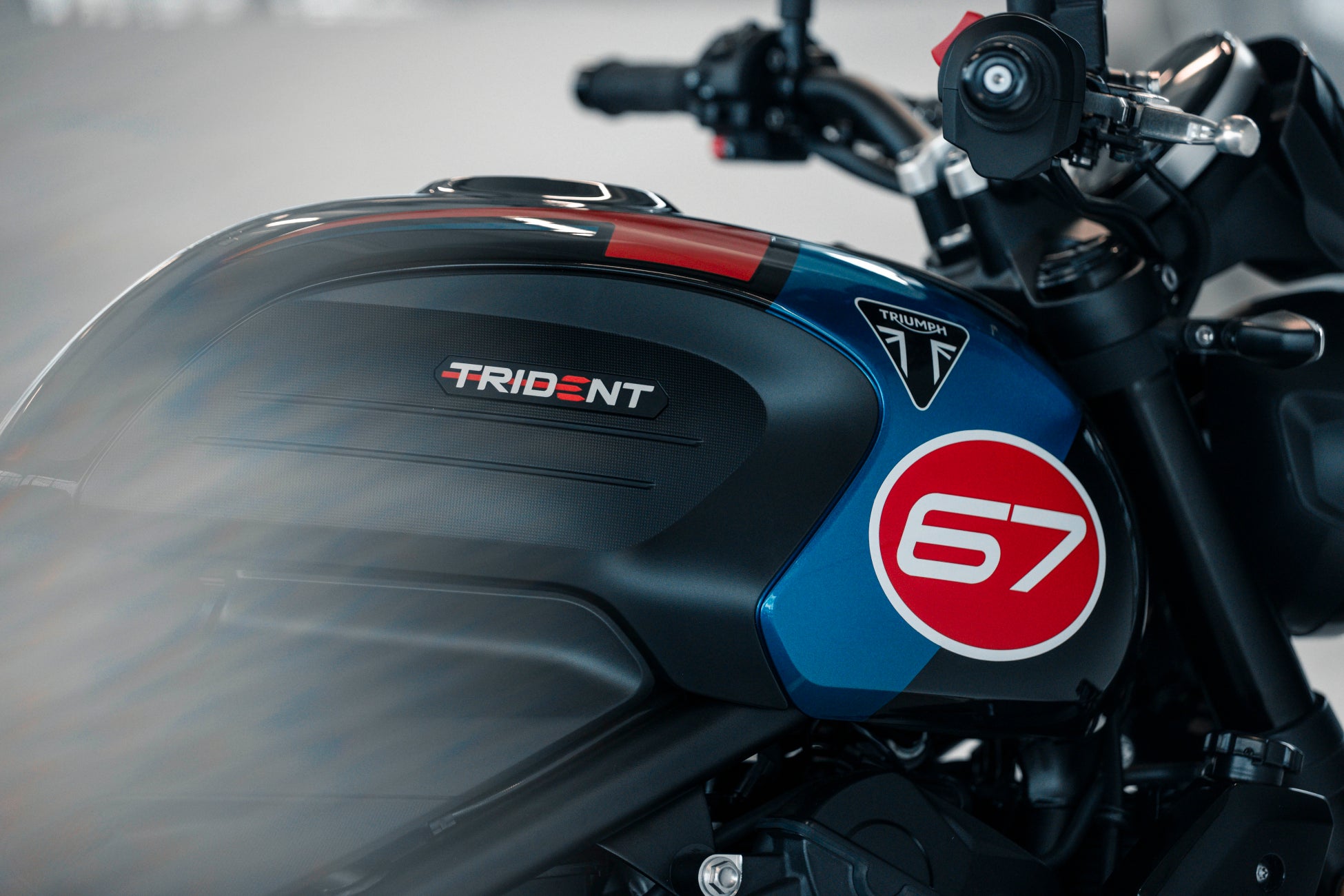 新しいスペシャルエディションは、レーシングバイクにインスパイアされた外観を継承し、マン島TTレースで5度の優勝を飾ったトライアンフの伝説的な「Slippery Sam」へのオマージュを捧げつつ、より現代的なグラフィックスキームを採用しています。なめらかなサファイアブラックのボディワークは、この特別版のベースとなる深みのある光沢のあるブラック仕上げを実現し、トライデント トリプル トリビュートに目立たない新しい外観をもたらします。タンク、テール、そしてフロントエンドを彩る大胆なコバルトブルーとディアブロレッドのハイライトとのコントラストが際立ちます。タンクにあしらわれた「67」のレースナンバーグラフィックは、トライデントの歴史上有名な大きな功績をスタイリッシュなオマージュしています。