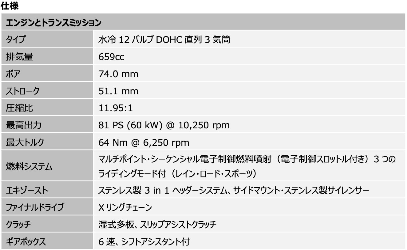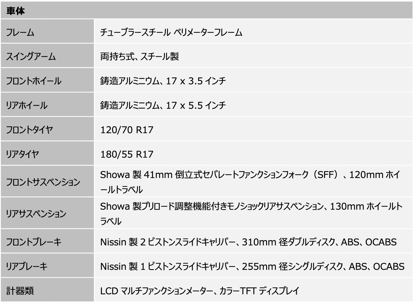 印象的なスタイリングと卓越した仕上げは、間違いなく人々の目を引くでしょう。トリプルエンジンの性能とライダー重視の最新テクノロジーは、毎日のライディングから休日のツーリングのシーンを劇的に変える事と確信しています。