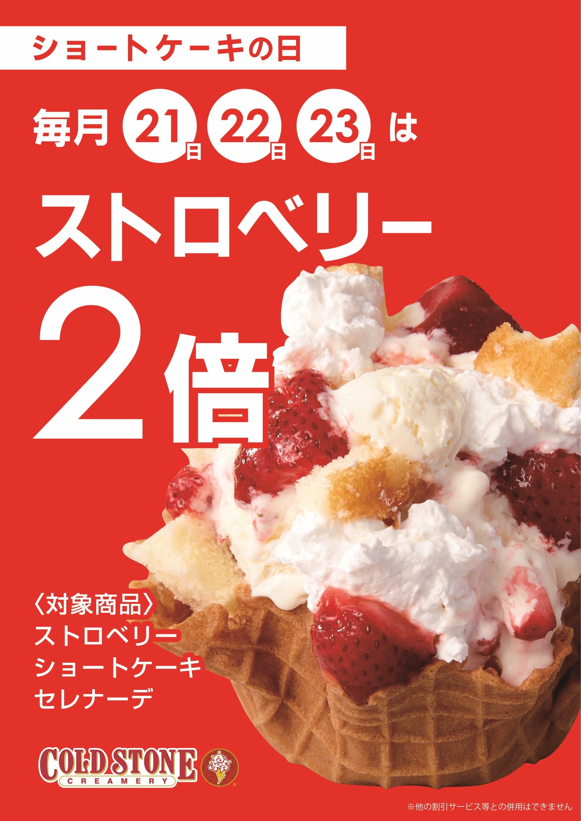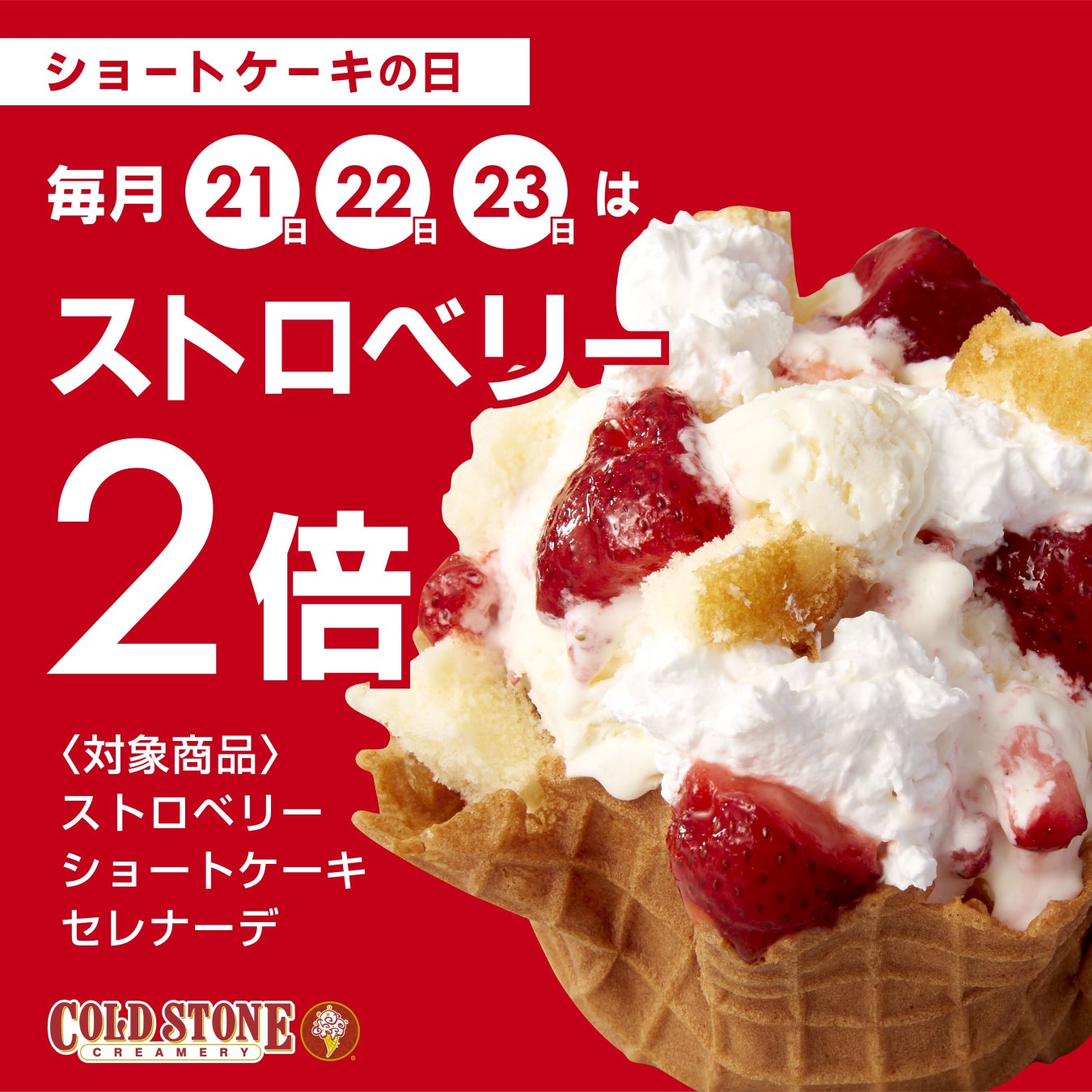 この度、コールド・ストーン・クリーマリー “初” のキャンペーンとして、「ショートケーキの日 ※キャンペーン」 を5月より毎月21・22・23日の3日間、ストロベリーショートケーキセレナーデをご注文のお客様を対象に、人気のストロベリートッピングが2倍となるキャンペーンを開始いたします!