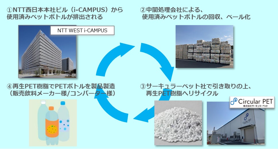 当社グループが事業活動を通じてオフィス等から排出する使用済みペットボトルについて、CPET社のペットボトルリサイクル工場へ供給、再生PET樹脂へリサイクルするプロジェクトです。このたび、本プロジェクトの基本合意について2024年6月25日にCPET社と締結しました。2024年7月以降、NTT西日本本社ビル(i-CAMPUSビル)から排出されるペットボトルの供給を開始します。