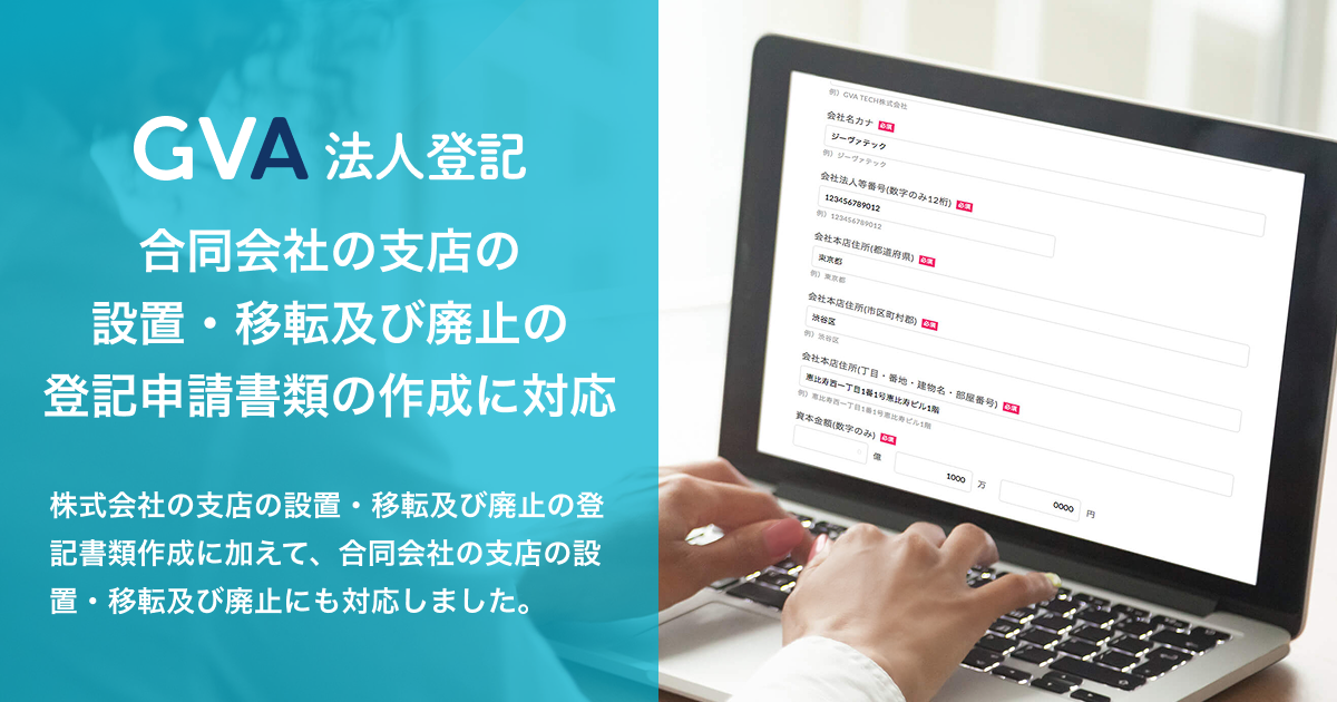 リーガルテックサービスの開発・運営を行うGVA TECH株式会社(本社:東京都港区、代表取締役:山本 俊)が運営するオンライン商業登記支援サービス「GVA 法人登記」にて、合同会社の支店の設置・移転及び廃止の登記申請書類作成に対応したことをお知らせいたします。