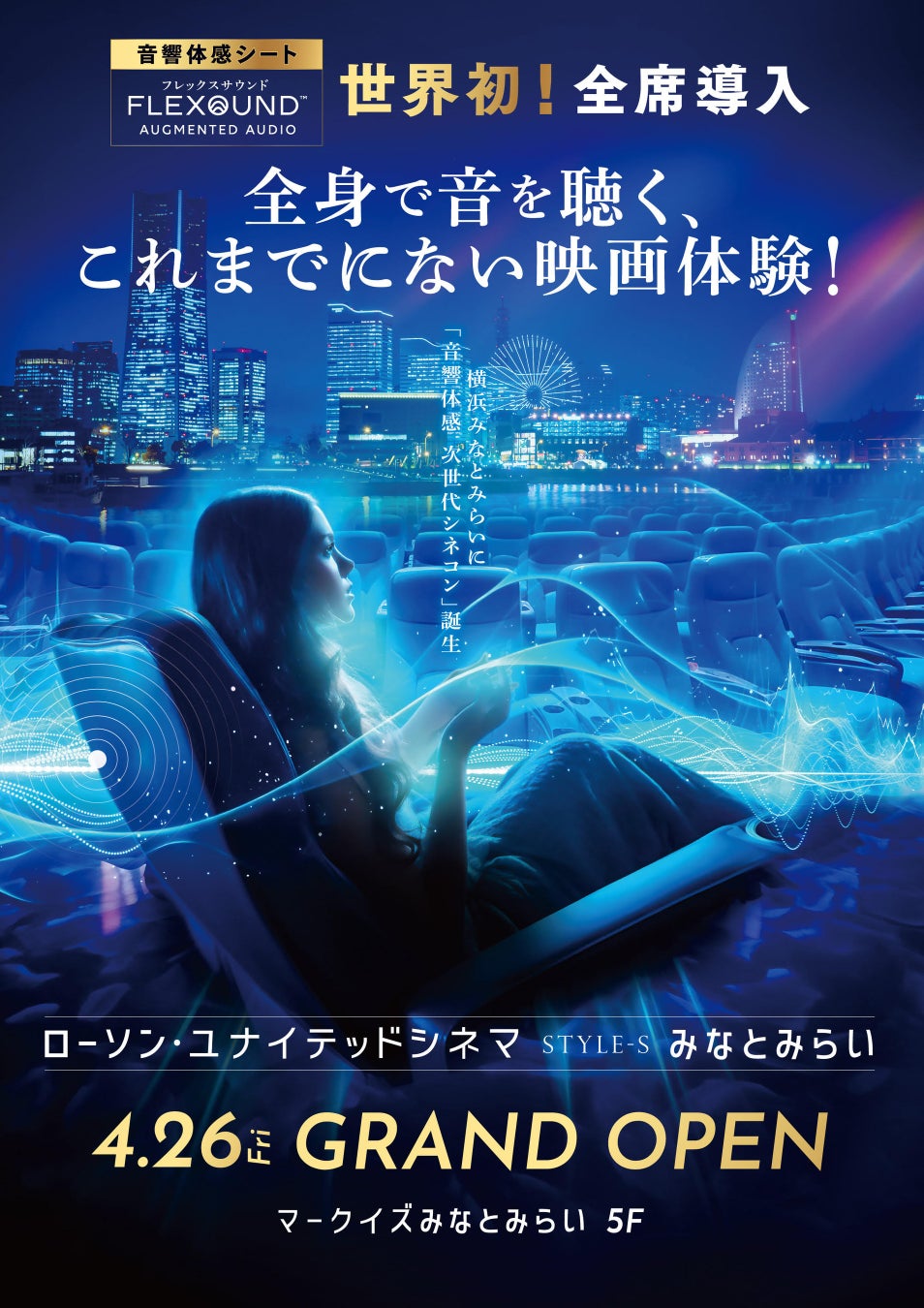 今回オープンする「ローソン・ユナイテッドシネマ STYLE-S みなとみらい」は、世界で初めて全スクリーン・全席に“没入型”音響体感システム【FLEXOUND Augmented Audio™】(以下、「FLEXOUND」)を導入した映画館です。FLEXOUNDが内蔵されたシートの枕や背部から発する「音と振動」によって、身体全体で音を感じることができ、映像とともにより映画の本質的な価値をお楽しみいただけます。また、同館では、ローソン店舗で販売しているオリジナル冷凍デザートをローソン・ユナイテッドシネマのオリジナルパッケージで提供するほか、ナッツやチョコレートなどのナチュラルローソン菓子も販売いたします。