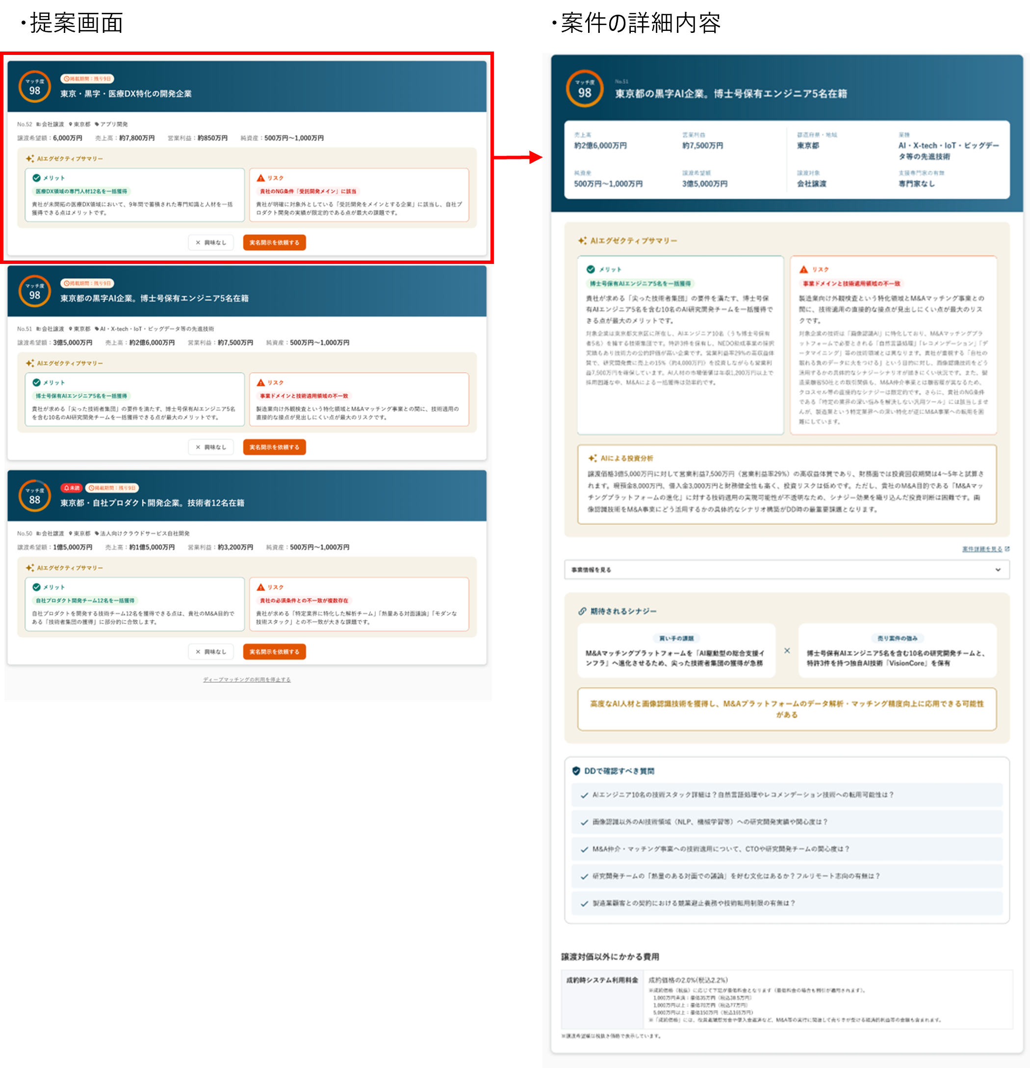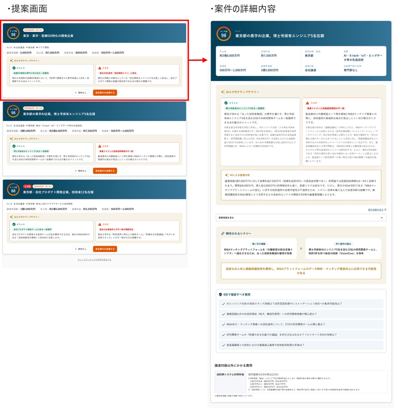 自動で提案が届くため、買い手のM&A案件探しに要する時間を大幅に削減できます。また、買い手自身が気づいていなかったシナジーを発見する機会も創出します。