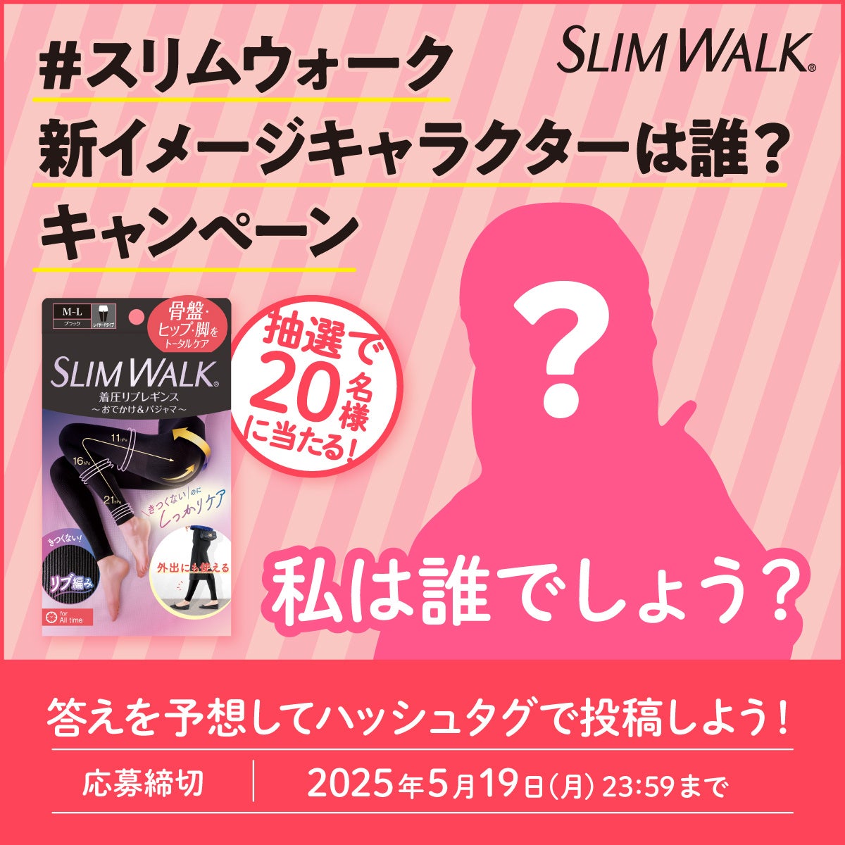 ピップ株式会社(本社:大阪市中央区、代表取締役社長:松浦由治)が展開する着圧レッグウェアブランド「スリムウォーク」は、新イメージキャラクターの就任に先駆け、スリムウォーク公式X(旧Twitter)にて「#スリムウォーク新イメージキャラクターは誰?」キャンペーンを開催します。本キャンペーンでは、公式X上に投稿された新イメージキャラクターのシルエット画像から誰なのかを予想し、2025年5月13日(火)10:00〜5月19日(月)23:59の期間中に「#スリムウォーク新イメージキャラクターは誰」をつけて投稿いただきます。その中から抽選で20名様に「スリムウォーク 着圧リブレギンス」をプレゼントします。