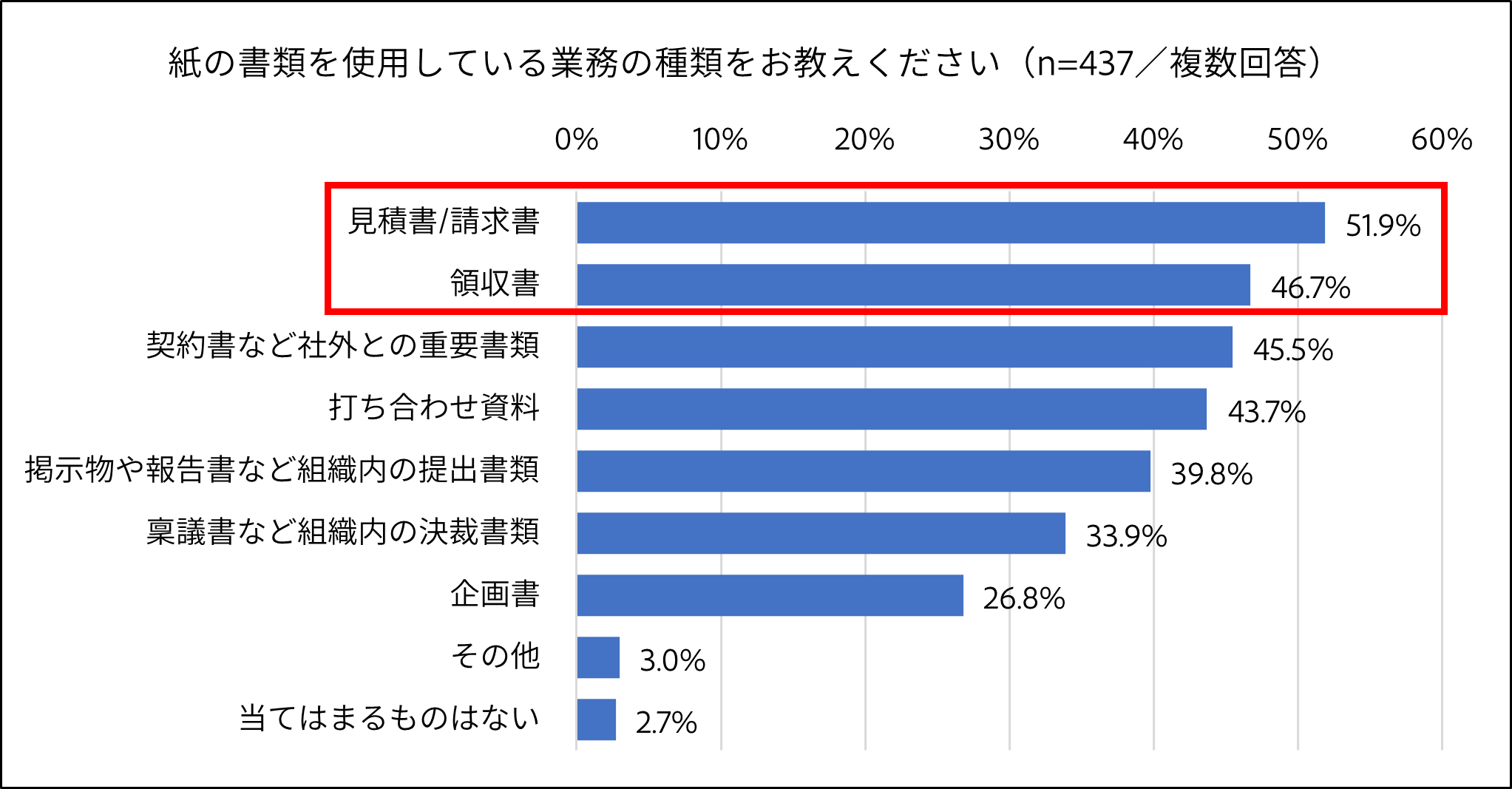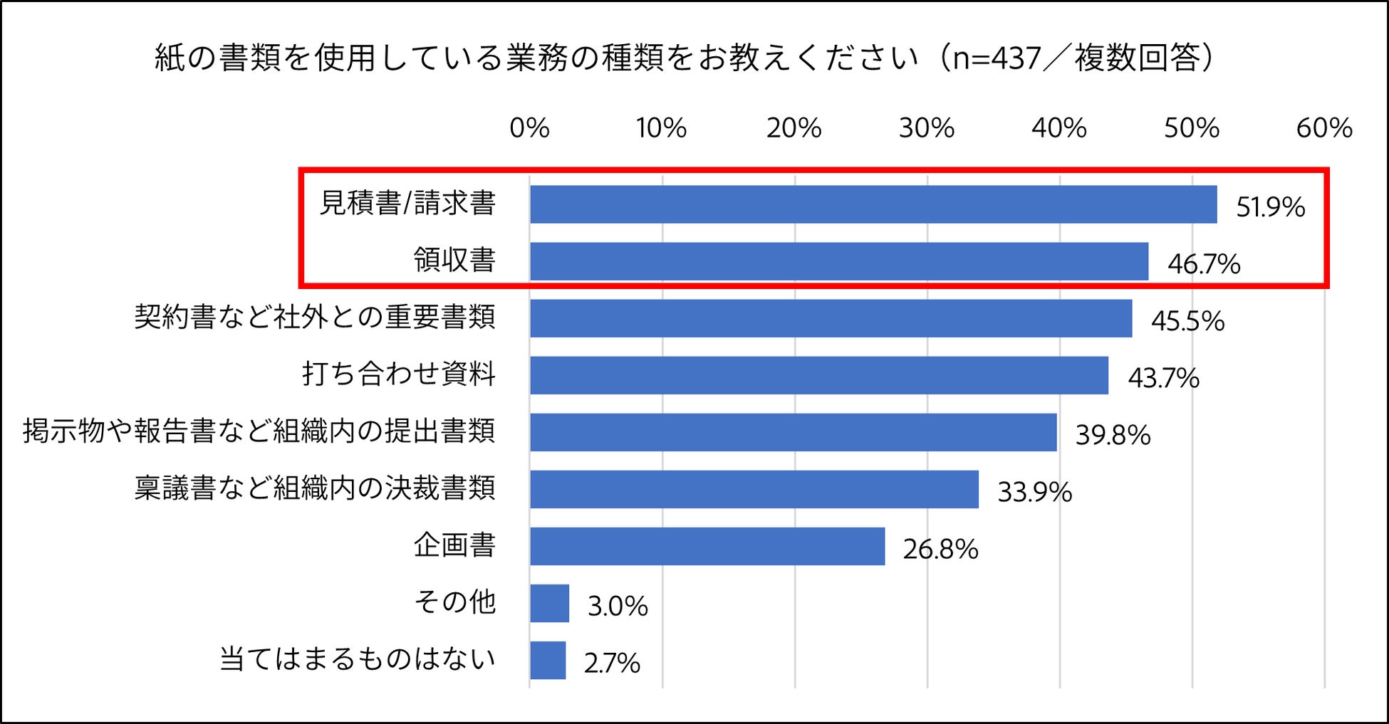 全体の87.4%が「週に1日以上」、約半数(49. 6%)が「毎日」紙の書類を使用。最も多く使用している業務は「見積書/請求書(51.9%)」や「領収書(46.7%)」で、デジタル化で印刷を減らせると思われている業務も「見積書/請求書(36.9%)」が最多