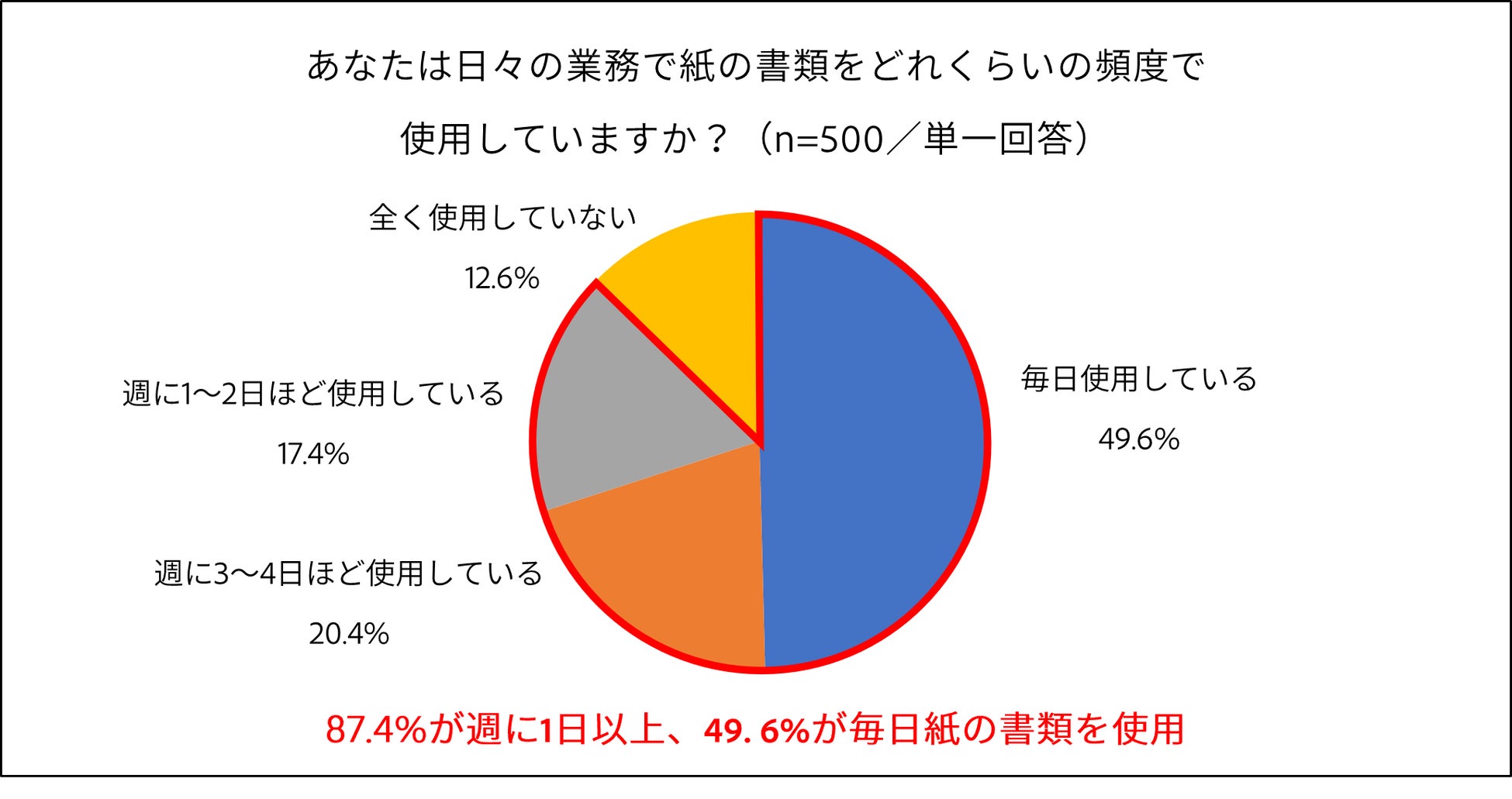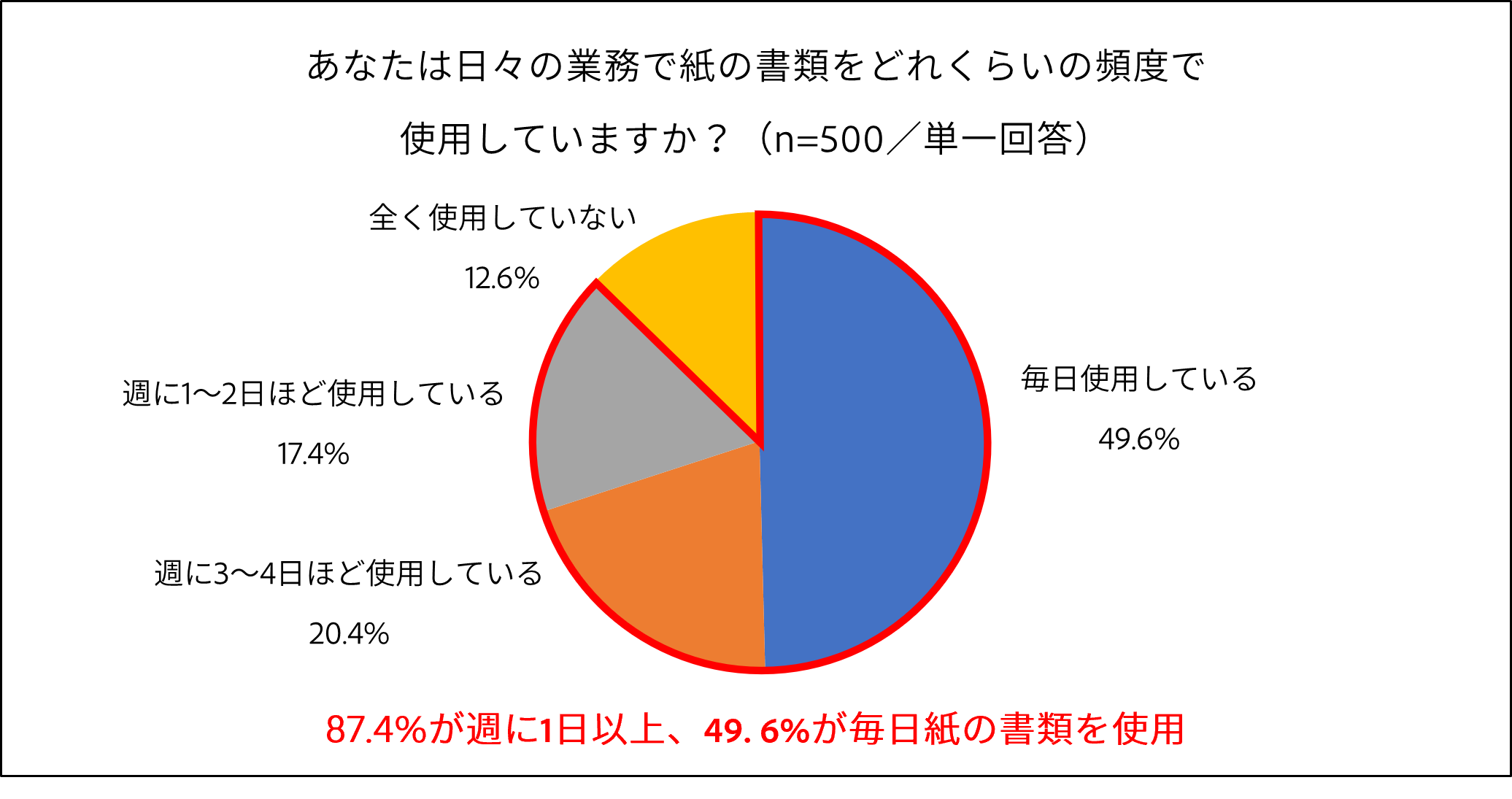 紙の書類の使用頻度について、全体の87.4%が「週に1日以上」、約半数(49. 6%)が「毎日」紙を使用している結果となりました。