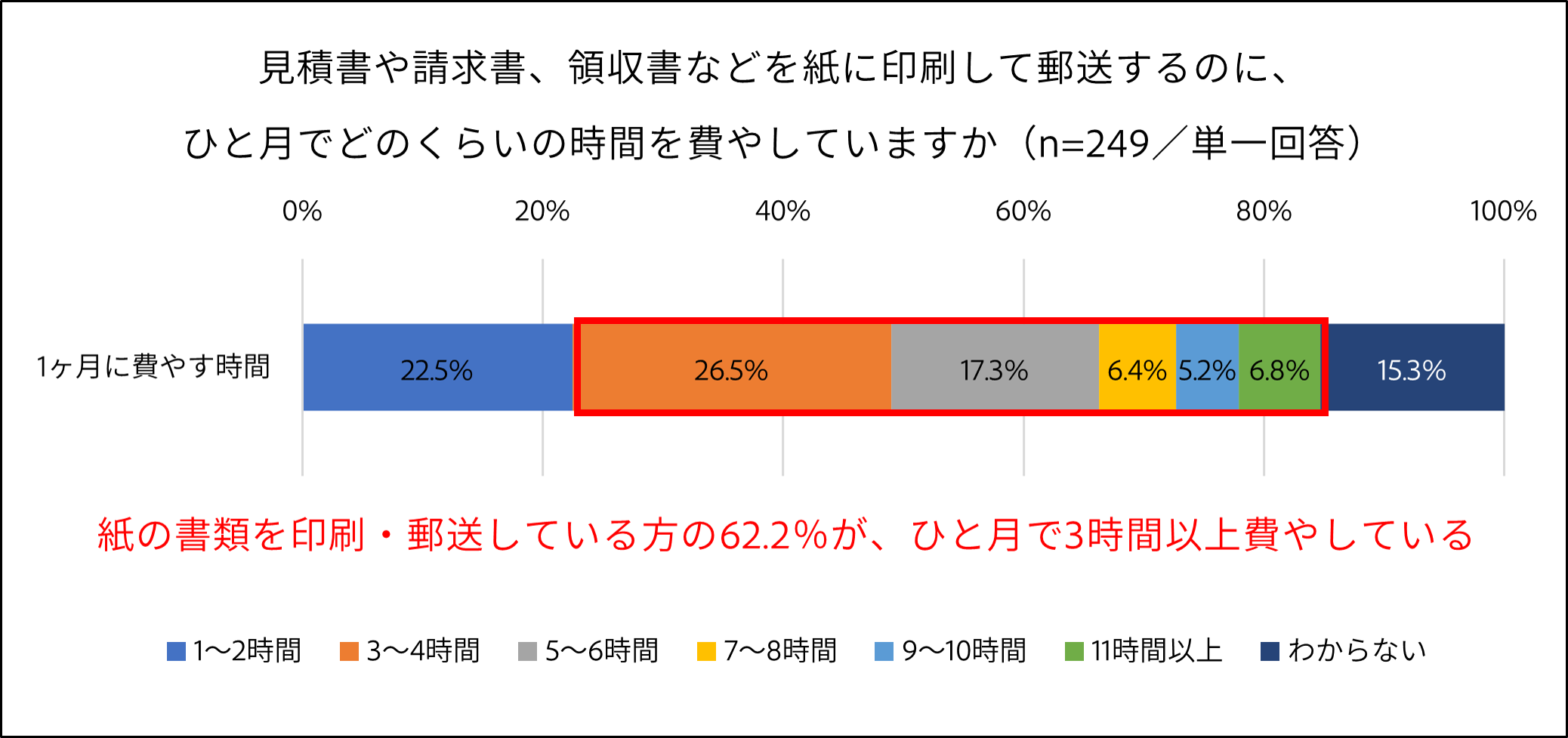 請求書や支払い確認書の郵送が遅れたことで業務進行や締め切りに支障が生じる、あるいは業務が中断するなど、郵送物の配送に関連した時間的制約が業務の進行に影響した経験について聞いたところ、全体の68%の方が「経験あり」と回答しました。また、紙の書類を印刷して郵送していると回答した249名を対象に、ひと月でどれくらいの量を印刷して郵送しているか聞いたところ、最も多かったのが「11通~100通ほど」で49%、次いで「1通~10通ほど(31.7%)」「101通~1000通ほど(15.3%)」「1001通以上(4%)」と続きました。さらに、印刷・郵送業務にどれくらいの時間をかけているかを聞いたところ、3時間以上かけていると回答した方の割合は62.2%にものぼり、多くの方の業務負担となっていることが分かりました。