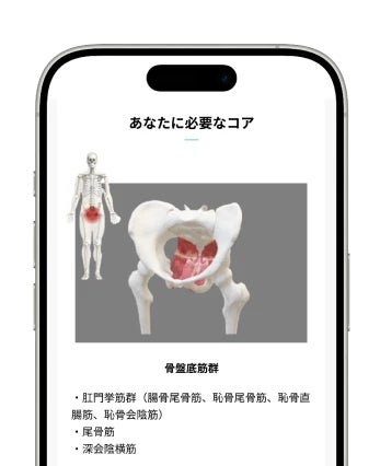 動作解析結果に対して、スコアが低かったコアを詳しく説明。そのコアが身体の中でどういう働きをしているか、どこの筋肉と連動しているか、どういった不調が生じるかなどが確認できます。