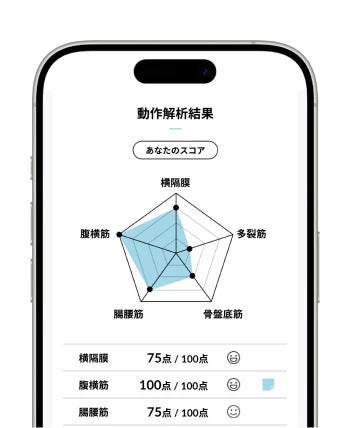 本サービスは、コアの動き、特にインナーマッスルの機能性をAI技術で解析し、動作や姿勢を可視化・スコア化することで、会員様の身体状態に応じた最適なアプローチを提案することが可能になります。