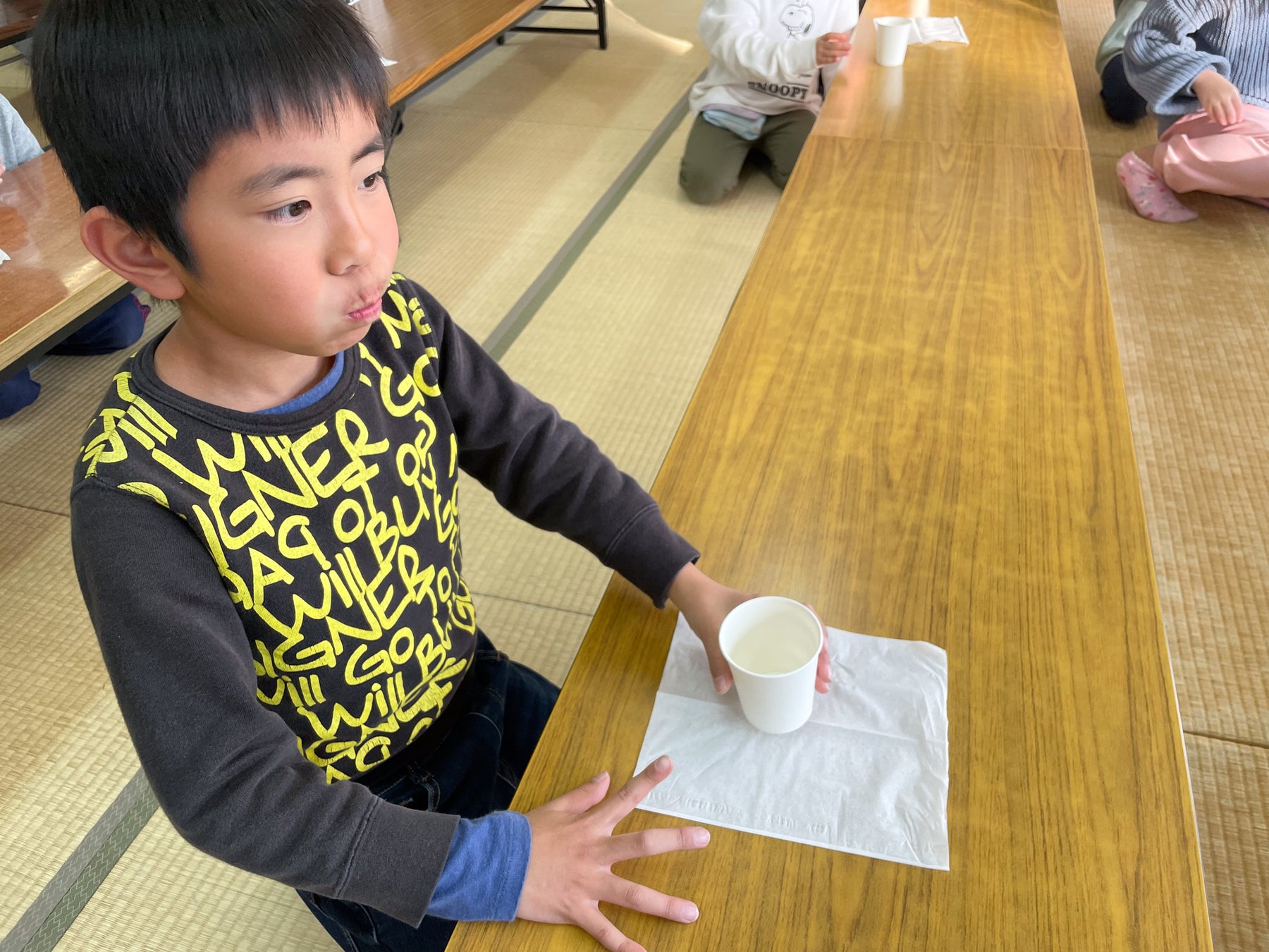 初日には2名の歯科専門職が放課後児童クラブを訪問し、おやつタイム後の児童に向けてフッ化物洗口の効果について説明を行いました。説明後、フッ化物洗口液が入った紙コップが児童に手渡されました。
