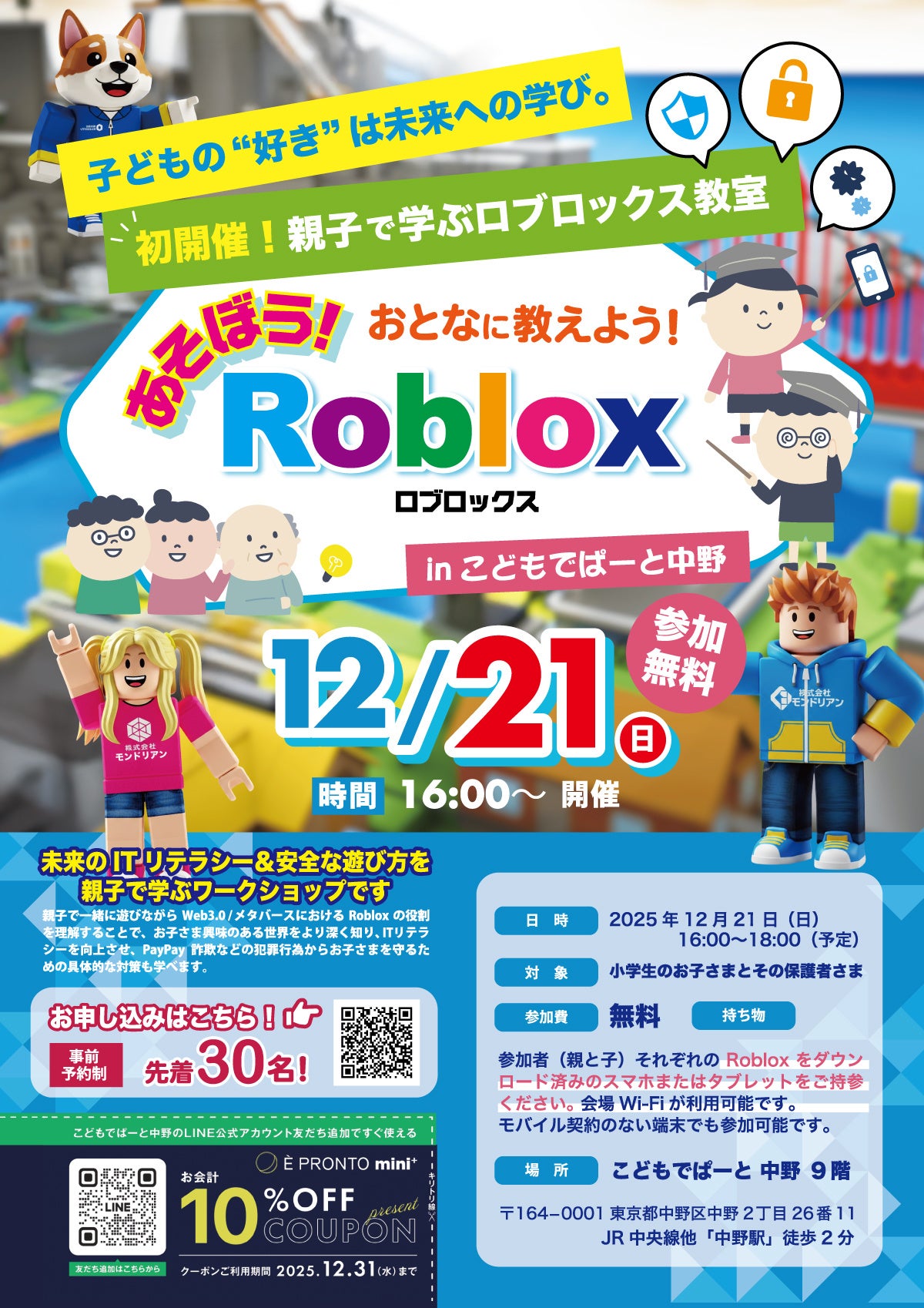 ヒューリック株式会社(本社:東京都中央区、代表取締役社長:前田隆也)と、松竹芸能株式会社(本社:大阪府大阪市、代表取締役社長:山中正博)は、2025年12月21日(日)、大人と子どもの「情報分断」解消およびITリテラシー向上のためのRobloxワークショップをこどもでぱーと中野にて開催することを決定しましたのでお知らせいたします。