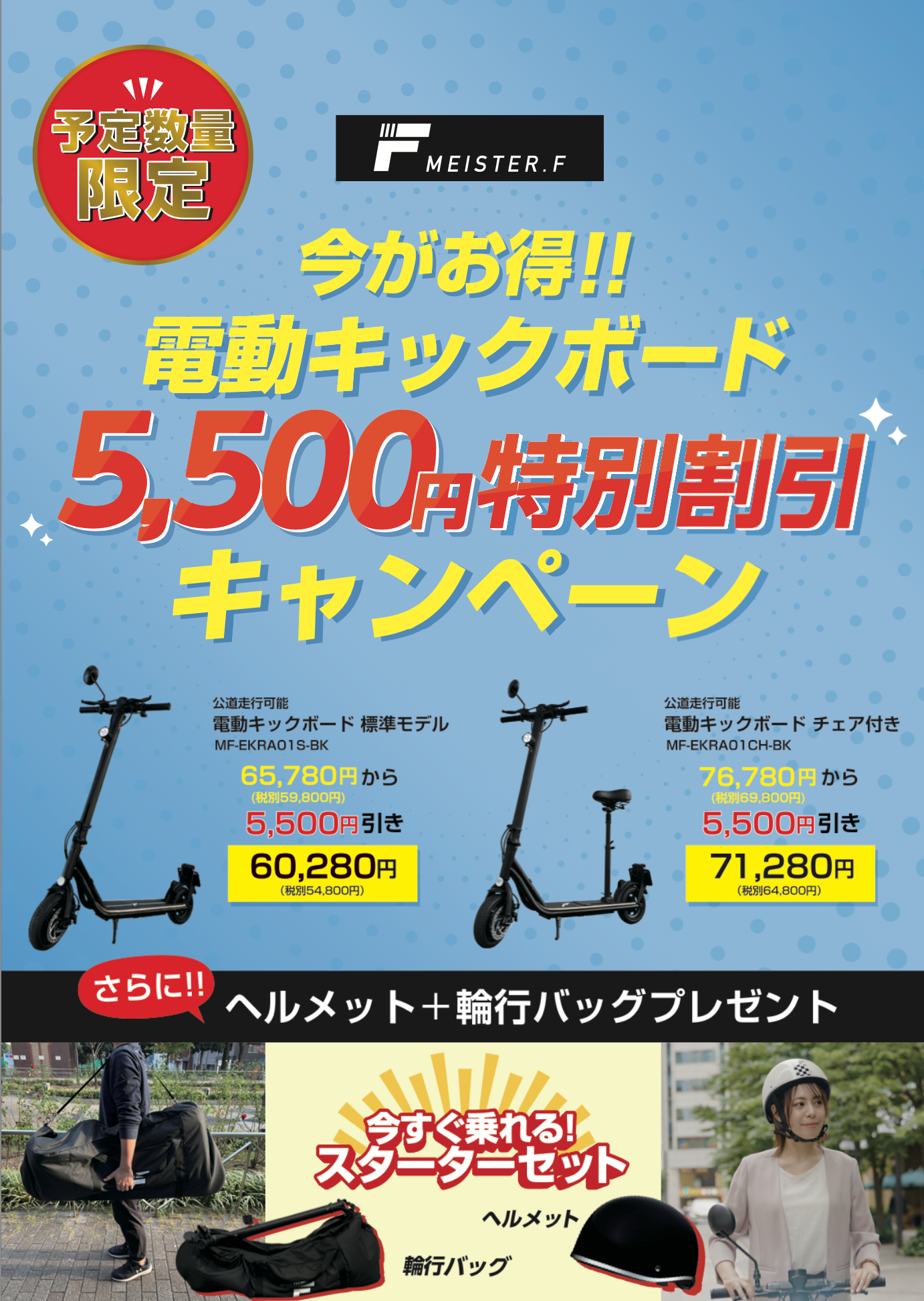 本イベントは2022年6月に開催されたビックカメラ京王調布店でたくさんの方にご試乗いただき、盛況のうち終了した事を受けて、第2弾の開催が決定しました。「トリエ京王調布C館前どんぐりひろば」にて実施し、6⽉24⽇(土)と25⽇(日)の2⽇間ともに、開催時間は昼11:00から⼣⽅17:00までとなります。また、試乗後のアンケート にお答えいただいたお客様には、MEISTER.Fオリジナルステッカーやスポーツタオル、エコバックのプレゼントを⾏います。