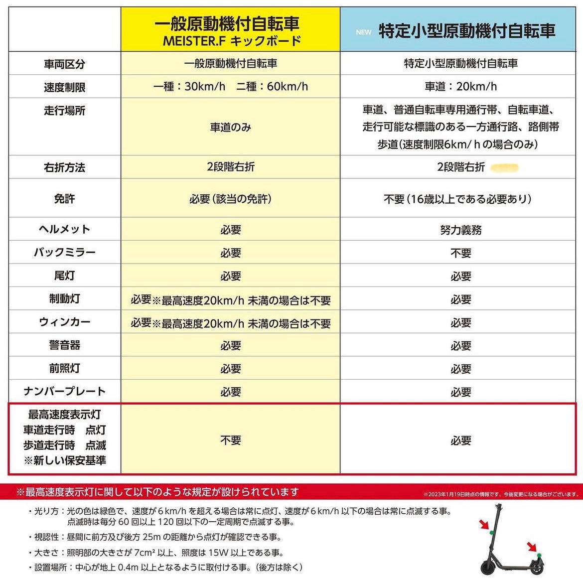 ※MEISTER.Fの電動キックボードは、道路交通法が7月に施行された後も、ヘルメットを着用して公道を走行で原付区分の電動キックボードとして、ご利用し続けて頂く事ができます。