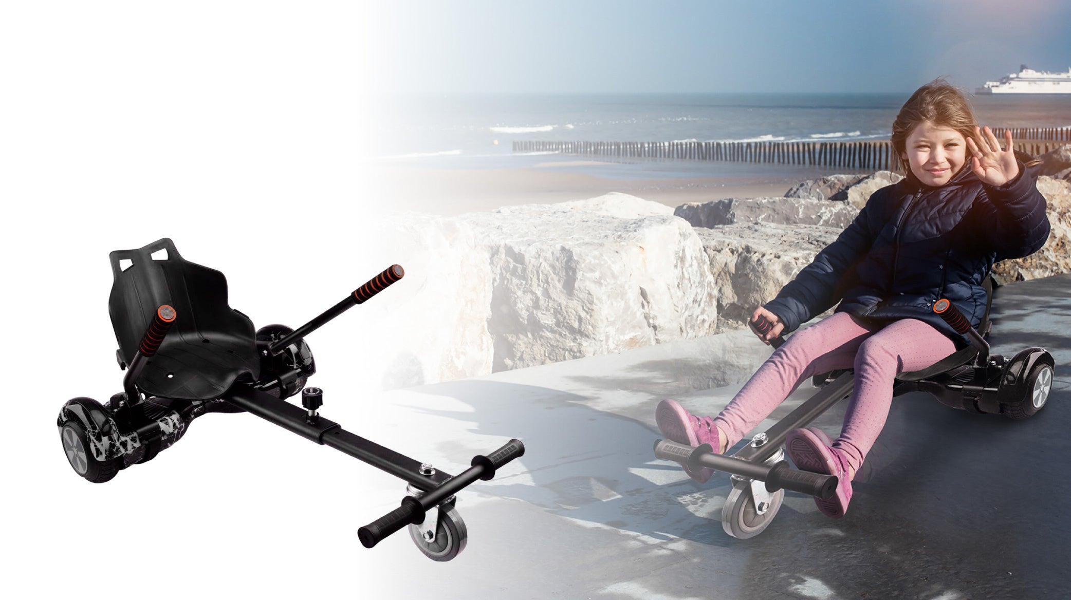 ⾜の重⼼移動で運転をコントロールする⽴ち乗りとは違い、ハンドルで運転操作し座って乗ることができるので、お⼦様 も簡単に楽しくバランスボードを乗りこなして頂けます。