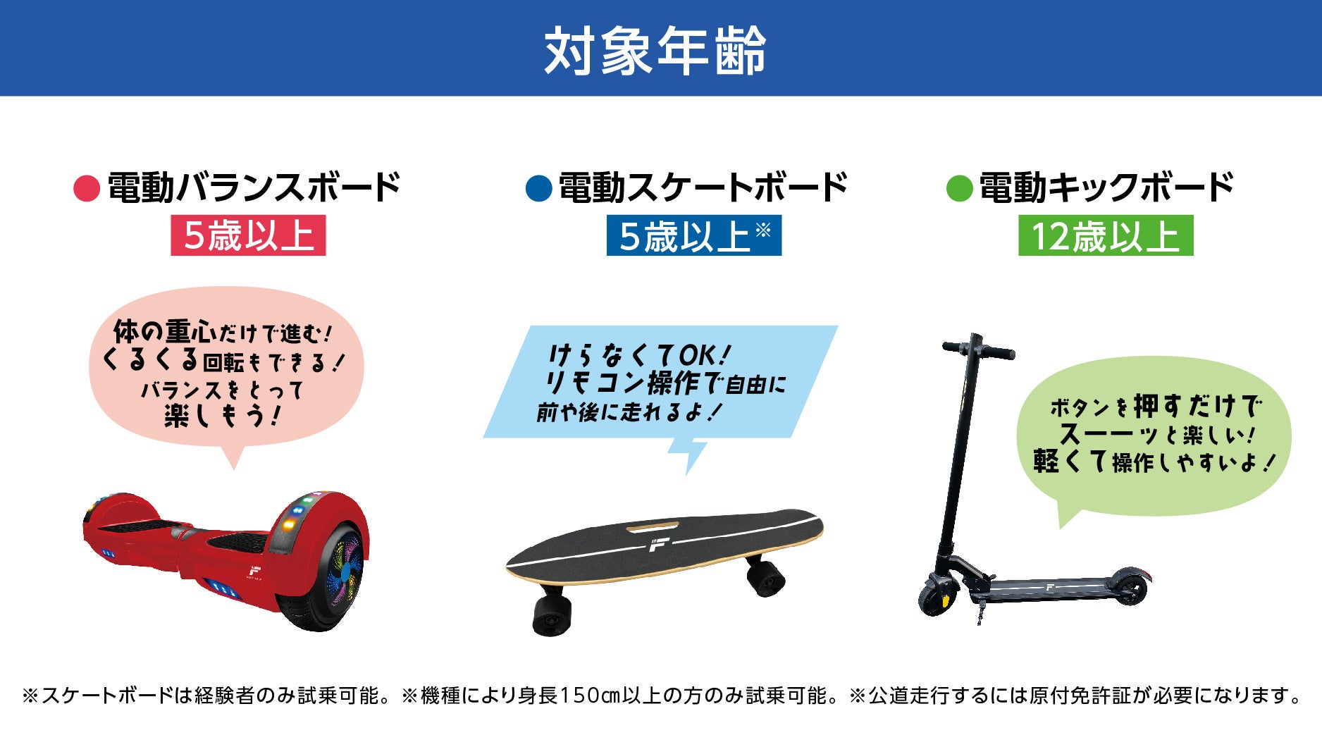 対象年齢は電動バランスボードは5歳以上、電動スケートボード5歳以上、電動キックボード12歳以上からとなっております。スタッフがお子様のご試乗をサポートし、初めての電動モビリティを乗りこなす挑戦を応援します。