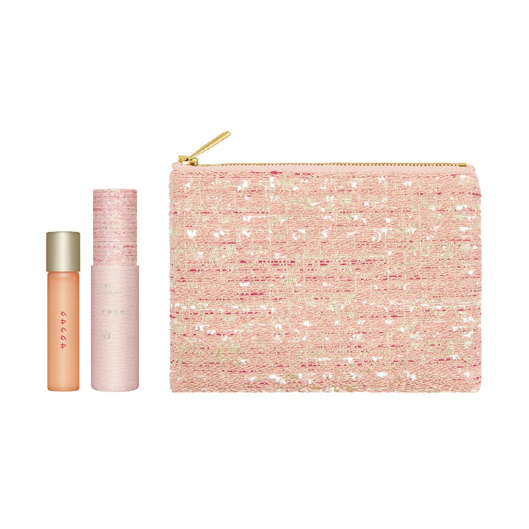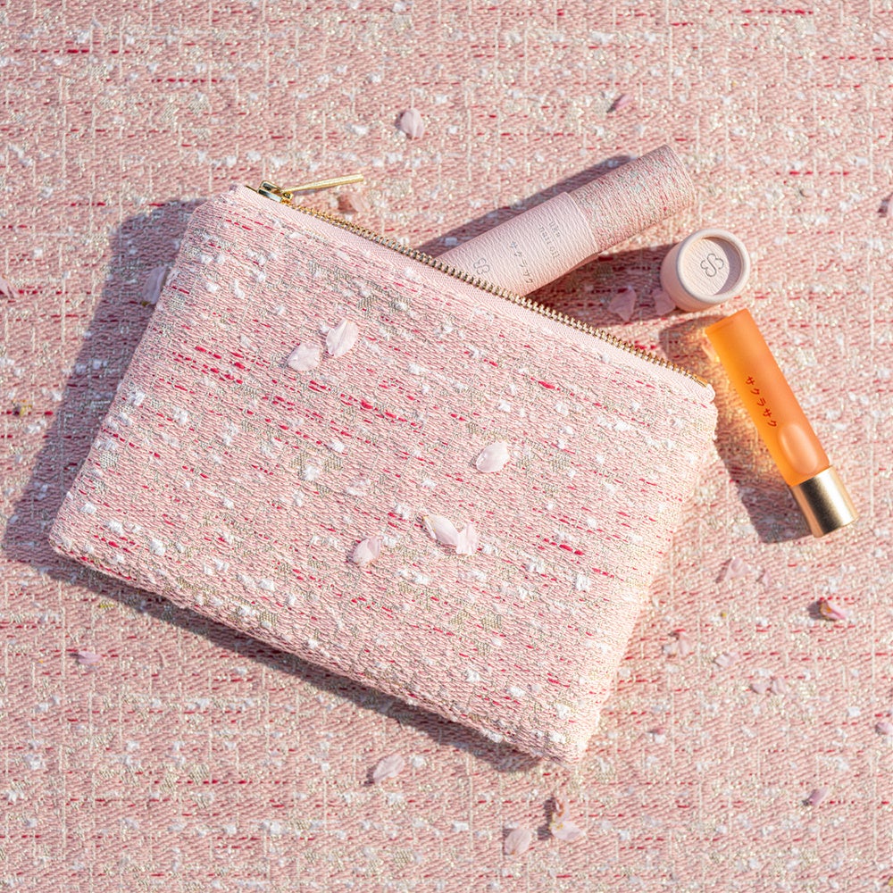 新しいテキスタイルは、表情の異なる2色のピンクとゴールドが織りこまれた優雅で美しいパターン。深みのあるピンクが加わったことでコントラストが生まれ、春の陽光の中に浮かび上がる桜の花びらのように、美しい輝きを放ちます。ポーチのインナーの色も深みのあるピンクで甘くなりすぎず洗練された印象に。美しい桜色のファスナーを開けるとあらわれる鮮やかなインナーとのコンビネーションに気持ちが高まります。蓋を開けたときに見える内筒部分にテキスタイルのデザインをうつしました。外筒はソメイヨシノをイメージした 柔らかなピンク色。上品な風合いの和紙と金の箔押しで仕上げました。ボトルはサクラサク限定のピンクのフロストボトルにピンクの文字色を採用。パソコンを打つ指に、ペンを持つ手に、サクラが開花した時のような高揚感をプラスします。