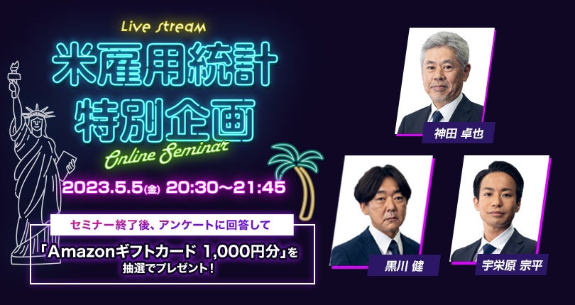 外為どっとコムでは、為替業界のみならず全てのマーケット関係者が注目する経済指標「米国雇用統計」を解説する無料オンラインセミナー、またリアルトレードを配信いたします。
