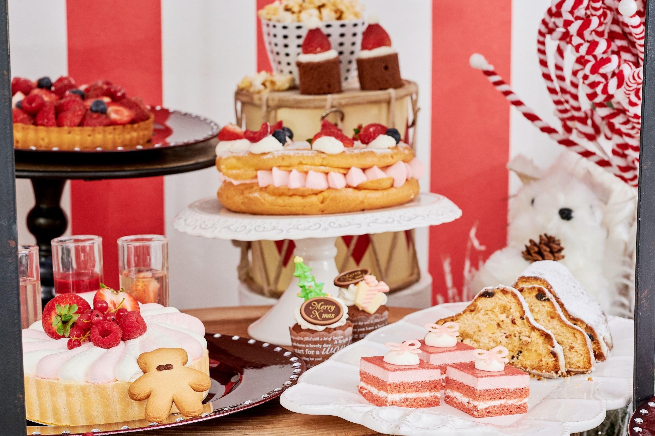 サーカス小屋をイメージしたシャルロットバニーユや、輪くぐりを連想させるパリブレストのほか、苺をサンタの帽子に見立てたロールケーキやシュトーレン、クグロフなどクリスマススイーツがビュッフェボードを華やかに彩ります。