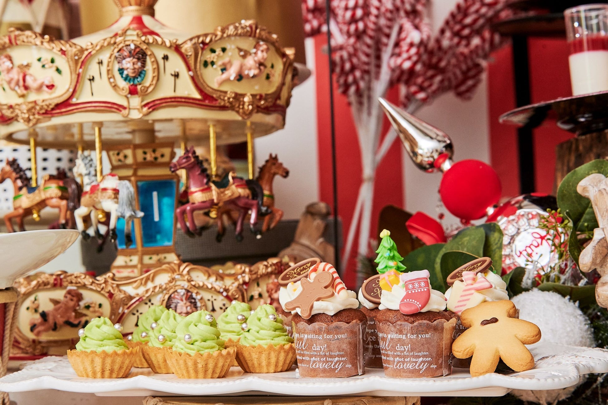 ツリーやリースなどのクリスマスデコレーションが施された賑やかな雰囲気の中で心躍るひとときを時間をお過ごしください。