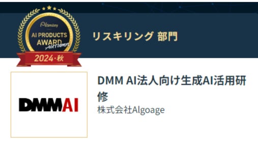 DMM AI法人向け生成AI活用研修は、実務で活かせる生成AIのスキルを効率よく習得できる法人向け研修プログラムです。AIリテラシーを高め、ビジネスの現場で活用できる実践的な内容が特長で、特に生成AI分野のニーズに即したリスキリング支援が高く評価されました。