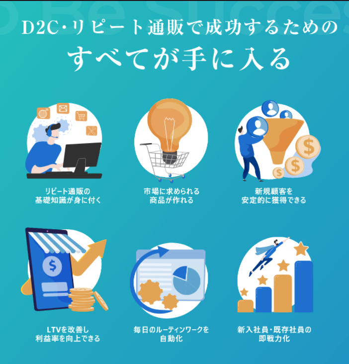 企画 製造 販売 のノウハウを学び、全てお任せで新しく社員を雇わず、たった1商品で億越えの新規事業を創るアカデミーとなっております。D2Cのノウハウを出し惜しむことなく1から解説しております。全6章(約3600分)に及ぶオンライン講座のカリキュラムをご用意。新規参入をご検討の方から、立ち上げてみたもののどう進めて良いか分からない、改善点が分からない、など様々な悩みを一挙に解決致します。