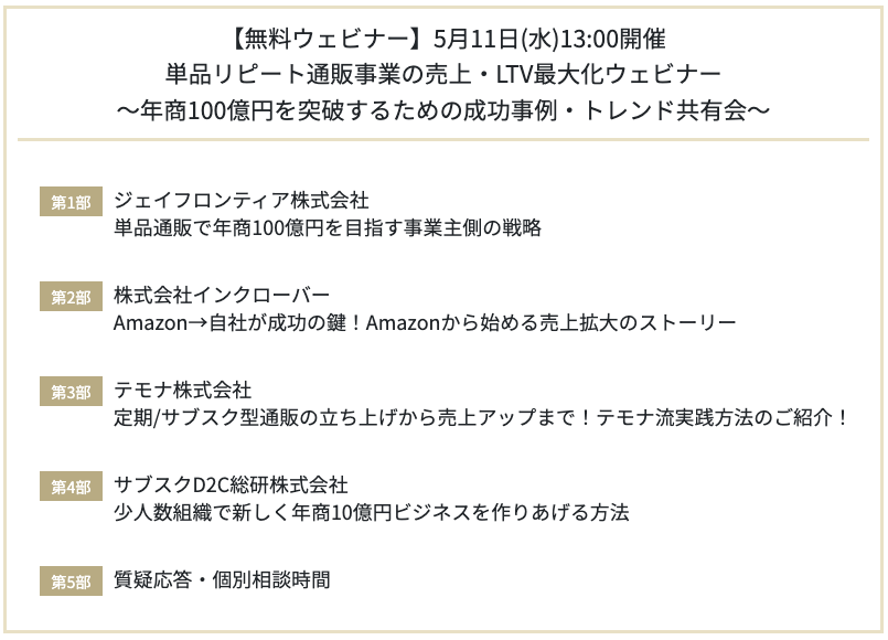 【5月11日(水)13時開催】単品リピート通販事業の売り上げ・LTV最大化ウェビナー