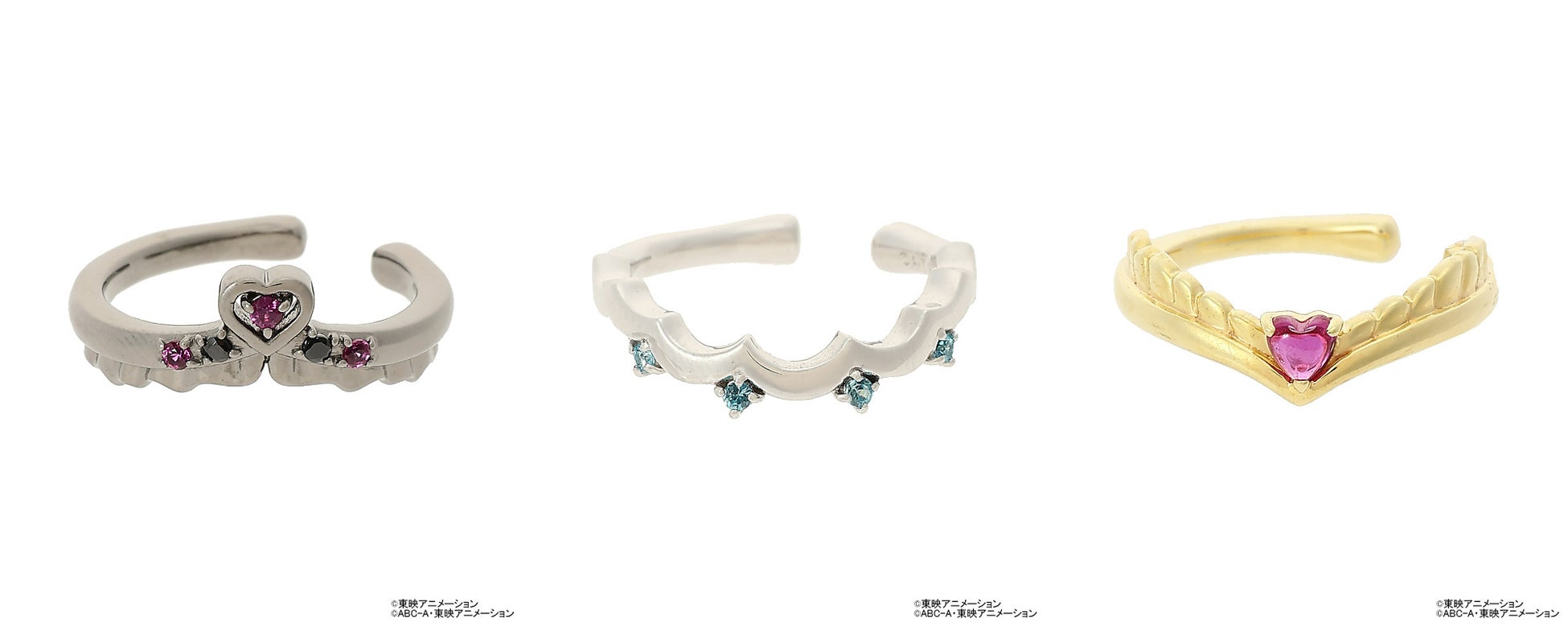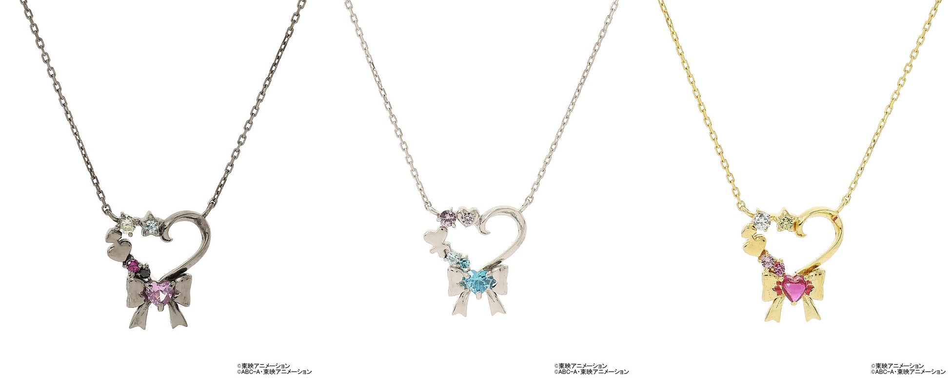 「Samantha Tiara(サマンサティアラ)」のラインナップは、「キュアブラック」、「キュアホワイト」、「シャイニールミナス」とパートナー妖精の3人をイメージしたネックレスやピンキーリング/イヤーカフや、作品のエンブレムをモチーフにしたネックレスなど全7種です。